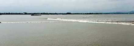 一线潮并非只有盐官才有哩。凡江道顺直,没有沙州的地方,潮头均呈一线,但都不如盐官好看。原因是盐官位与河槽宽度向上游急剧收缩之后的不远处,东、南两股潮交会后刚好成一直线,潮能集中,潮头特别高,通常为1—2米,有时可达3米以上。气势磅礴,潮景壮观。