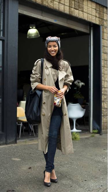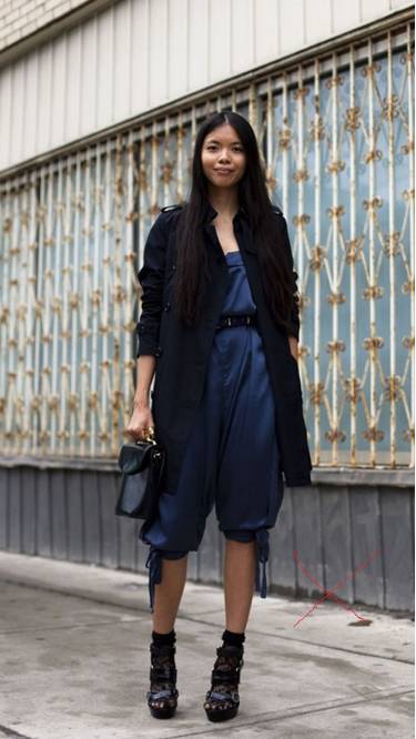 搭裙子穿的时候,风衣的肥瘦也很重要,腰身会显得人很妩媚。下述图中,明显黑人妹子的风衣太肥大,整体给人一种白板平面的印象。这一身,即使后面系了腰带,前片估计也会往前翘,不会好看,关键是号大了。卷发女这张很有线条感,婀娜多姿。