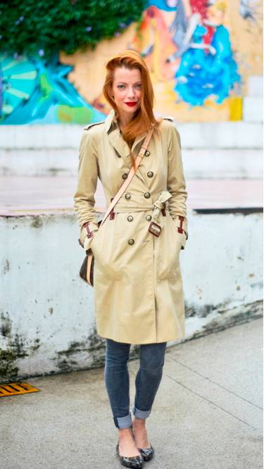 裤长、裤型很重要。仅根据个人审美,对下面一组照片中的风衣搭配做个点评。第一张图里的妹子明显挺潮,全身上下都很用心,上下身款式都很独特,但外搭了一件中规中矩的长款风衣,把“潮”气削减大半,风衣的酷感、干练、优雅感也统统不见,直接脱了风衣吧。中间的妹子胜在气质好,把风衣领子竖起来、脖子露出来,酷劲十足,甚至透着可爱劲,美中不足的是裤长稍短,看到露出的那一截小腿,总联想到藕。右边的美女看得出来属于优雅范。牛仔蓝色微喇很漂亮,不过风衣似乎对微喇塑造的大长腿有减损,换成小脚或紧身的蓝色牛仔、白色T不变,会更漂亮。