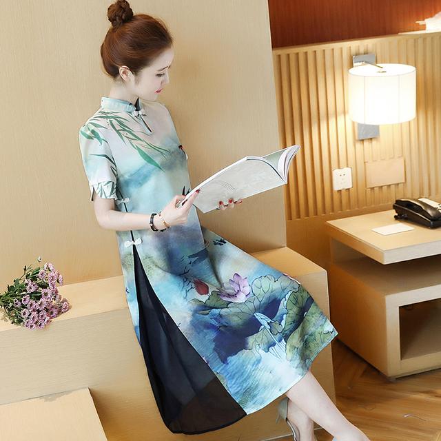 2017春夏新款改良版连衣裙,经典的传统立领,纯手工包边细腻柔和,勾勒出女性纤细修长的脖颈线条。经典时尚的旗袍装领型修饰您的颈部,精致的立体剪裁让您凹凸有致、身材纤细。