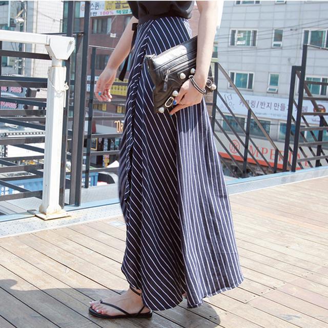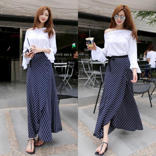 条纹A字大摆长裙,高腰显瘦通勤淑女系带半身裙,遮肉显瘦又不失服饰的整体型,下摆雪纺压褶的工艺,使下身富有层次感,高档又体面