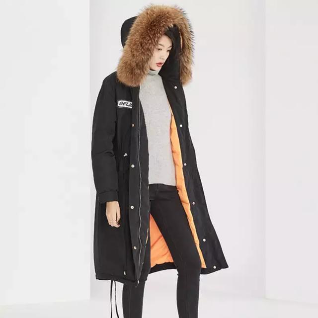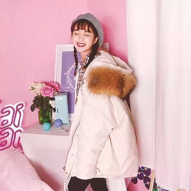 连帽款式的设计,悠闲中带着可爱。直筒宽松版型,慵懒悠闲风格随意。大毛领蓬松的感觉,很惬意同时又很御寒。