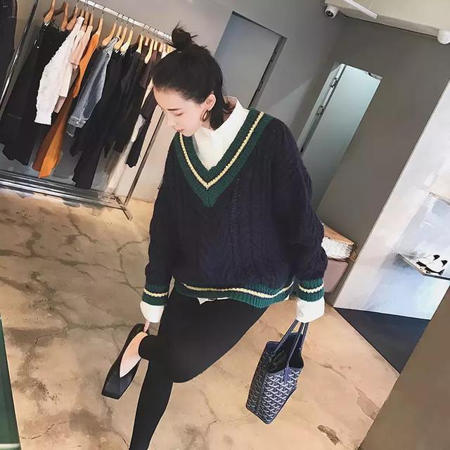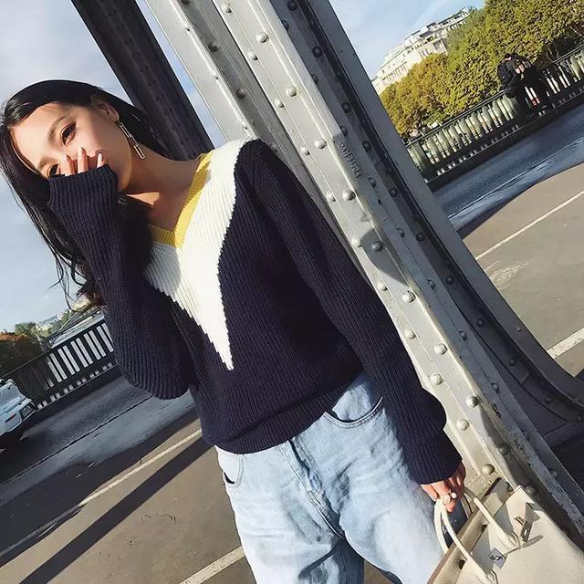 圆领针织衫是时尚的典型代表,拼接的不规则撞色的V领,有穿运动服的俏皮感,却是同样的精致性感。直筒的款型是耐穿也很好穿的款型。复古的藏青色很有清新雅致的韵味,细密的纹路也显的皮肤白质感好。套头款式很实用。