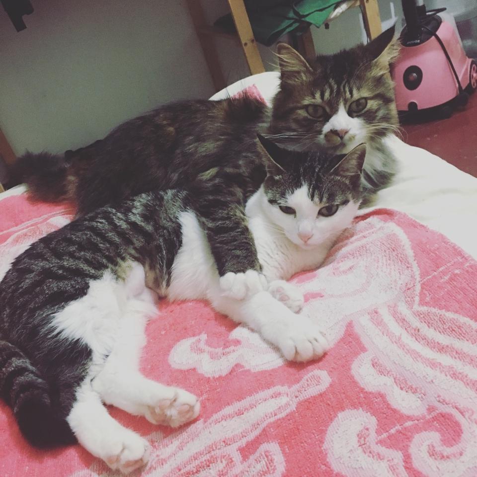 之前每天白天,只要是在家的日子,我家的床上就没有我的位置,不是猫妈躺着,就是猫爸躺着,不然就是他俩躺在一起互相舔毛秀恩爱喂狗粮秀的一手好恩爱!下面这俩就是妈妈和爸爸,全黑的是爸爸。