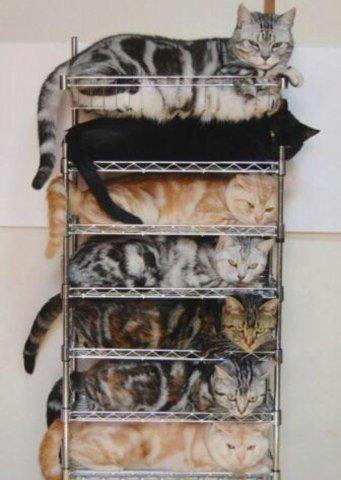 如果你没有那么多的空饮料箱,也可以直接把喵们放在架子上,只不过收纳效率稍微低一点点。