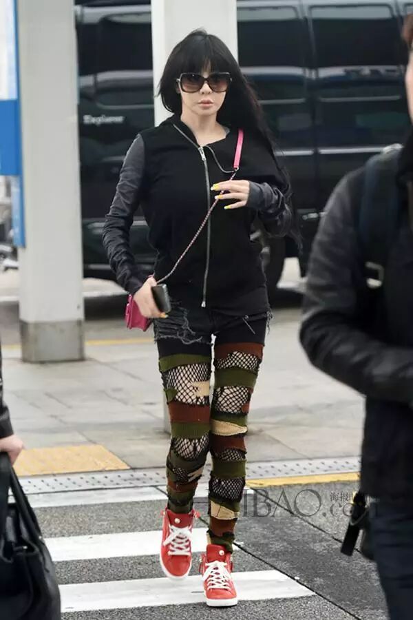 网袜拼破布实在很重口,2NE1组合成员朴春选了一双“戏份”这么重Leggings怎么配搭都显凌乱!