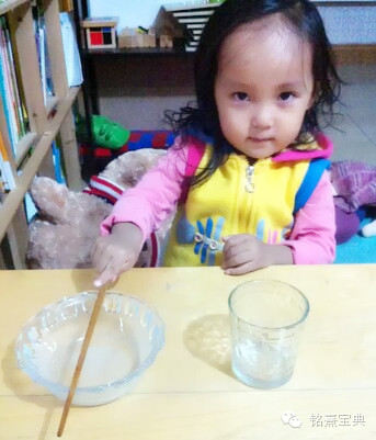 我先介绍声音的产生,告诉她两物体在空气中触碰,有振动产生,才会产生声音。我示范拍手,拍地板,让她跟着我一起做。然后我用筷子敲碗和杯子。敲出声音的时候,她开心地笑了,急着抢我手中的筷子:“我来做,我来做。”
