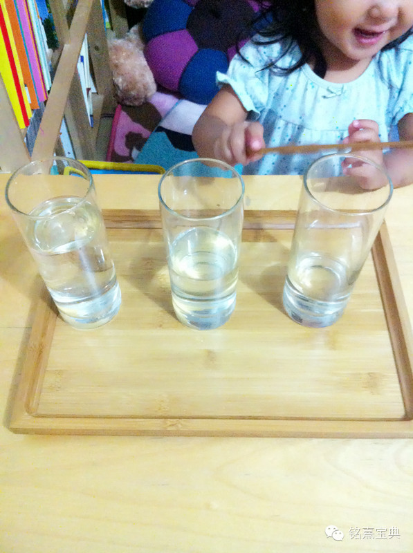 接下来,我又拿来三个相同的玻璃杯,往杯中倒入不同水位的冷水。然后,我按杯中水从少到多的顺序在每个杯上敲一下。然后再从多到少敲。敲完一组问她:“声音一样吗?”她答:“不一样。”