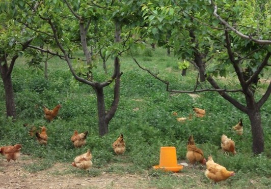 五、果园养畜禽。果园养畜禽,进行合理种养,可以互补利用,大大提高果农的经济效益。现已推广应用的有:果园养鸡、猪、鹅、龟等。以养鸡为例,鸡粪是优质肥料,可提高果园中土壤的肥力,减少肥料投资。由于鸡群喜欢啄食小昆虫,因而能捕食大量地面和果树茎部害虫;以及这些害虫的蛹和卵,从而使果园害虫大大减少,减少了用药量,农药残留机会少。加之果园内食料来源丰富,鸡群可捕食多种昆虫活食,还可采食青草等,既节省了饲料,又起到果园除草的作用,还增强鸡群体质,减少疾病发生。这样,有利于降低果品和鸡肉内的农药、化肥残留的有害成分含量。