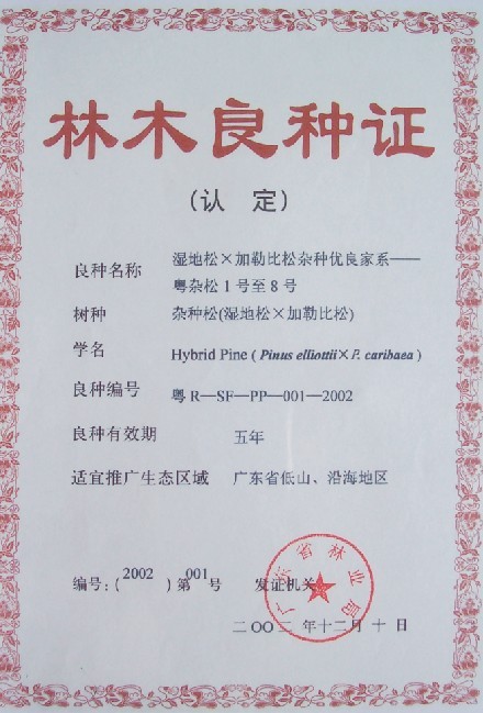 目前,湿加松试验点遍布全省范围,并扩展到邻近省份湖南、江西、福建等地。营建的湿加松工业原料林也迅速推广到全省及邻近的省份。虽然各个地点种植的湿加松家系不完全相同,立地条件和管理抚育措施也有很大差异,但湿加松生长明显优于湿地松,而干形较洪都拉斯加勒比松更为理想。在广东省林科院的一片测定林中,其自行选育的优良家系有8个生长量优于澳大利亚的参试家系,在适宜地区集约栽培条件下,湿加松良种10年生时平均树高12米、胸径20厘米,每亩蓄积量达到10立方米以上,材积生长比湿地松大1倍,增产效益明显。这批优良杂种已于2002年被广东省林木良种审定委员会认定为良种。