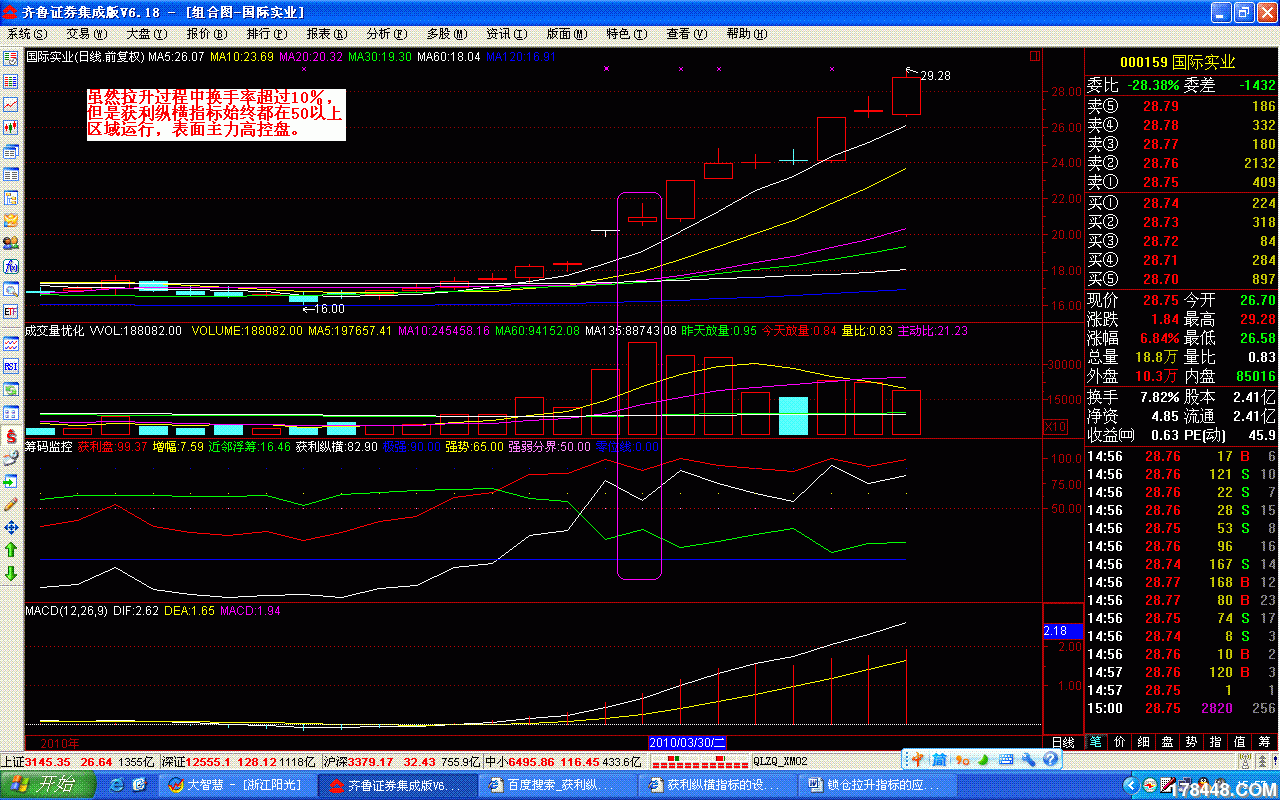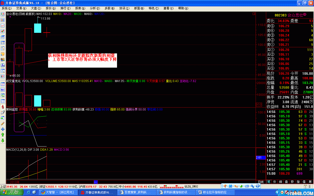 2.参考买入点:获利盘在40上方(最好在50轴上方以上,越大越好)穿近邻浮筹,突破50轴后收盘的换手率最好小于10%,最佳买入点是股价次日横盘收十字星,出小阴线或小阳线也可以,获利纵横指标值仍然在50以上。