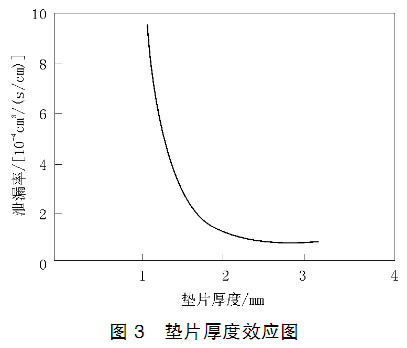 在同样的压紧载荷、同样的介质压力作用下,泄露率随垫片厚度的增加而减小。此外,垫片越厚,渗透泄露的界面积越大,渗透泄露率也就越大。另图3所示在某一恒定压力下,垫片厚度与泄漏率之间的关系。由图3可见:不能说垫片越厚,其密封性能越好。泄漏率随垫片厚度增加而减小,当厚度超过3 mm,曲线趋向一极小值。