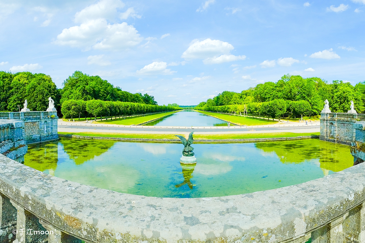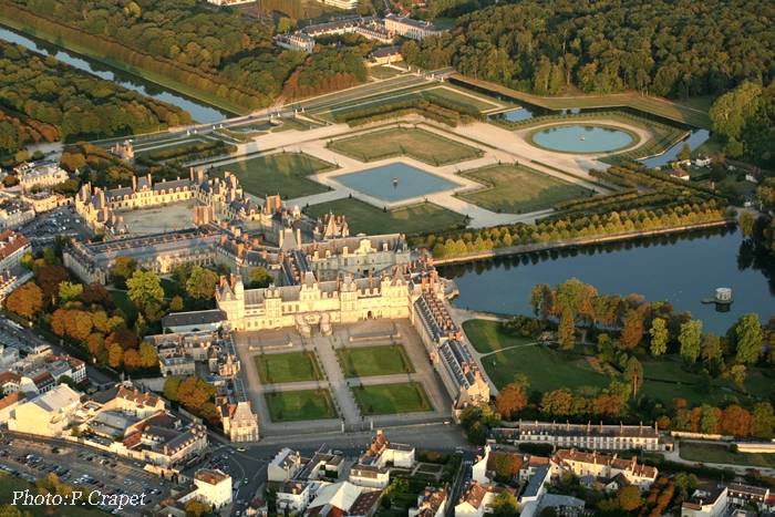 在网上找到的空中俯瞰图(向摄影师致谢)更能看出枫丹白露的构造,宫殿大气华美,被园林森林水池运河围绕。