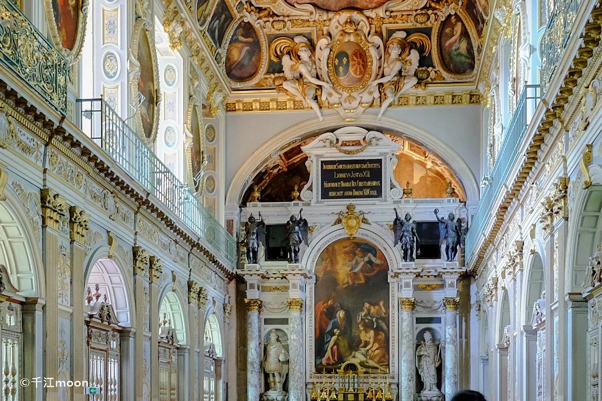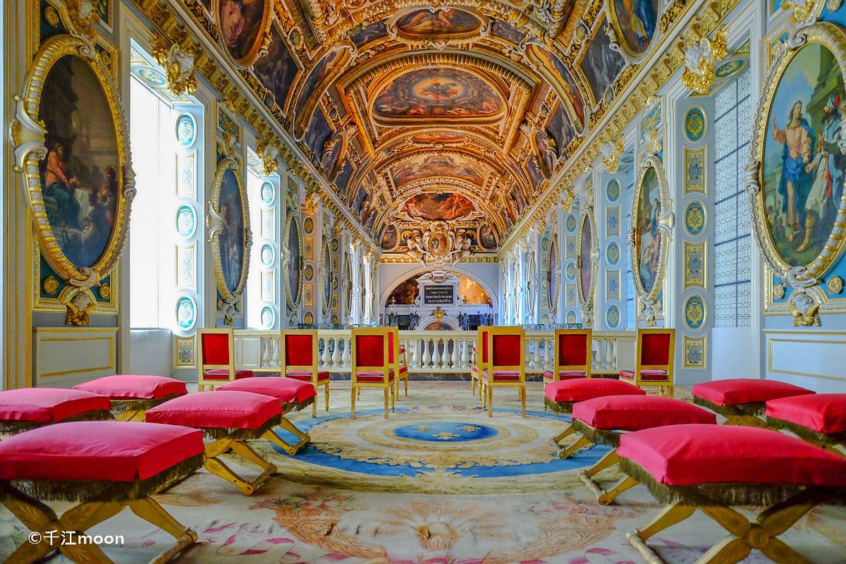 宫殿的舞会大厅长30米是对称的结构,并有六个拱门相对,拱门的上半部分被文艺复兴风格的油画和浮雕覆盖,下部则是胡桃木护墙,天花板上都是藻井雕饰,很有华美的视觉效果。