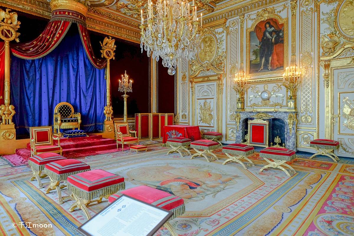 这个房间以前是国王寝宫,路易十三、路易十四都在这里住过,而拿破仑把寝宫改建成御座大厅。御座安放在殿室一侧铺着红地毯的三级台阶上,上面罩有红丝绒面子宝蓝里子的华盖帐幔,两支标有字母N的黄铜鹰形权杖位列两侧。门墙则皆以白色镶金为底,整个殿室的基色为红蓝白,显得庄重而华美。