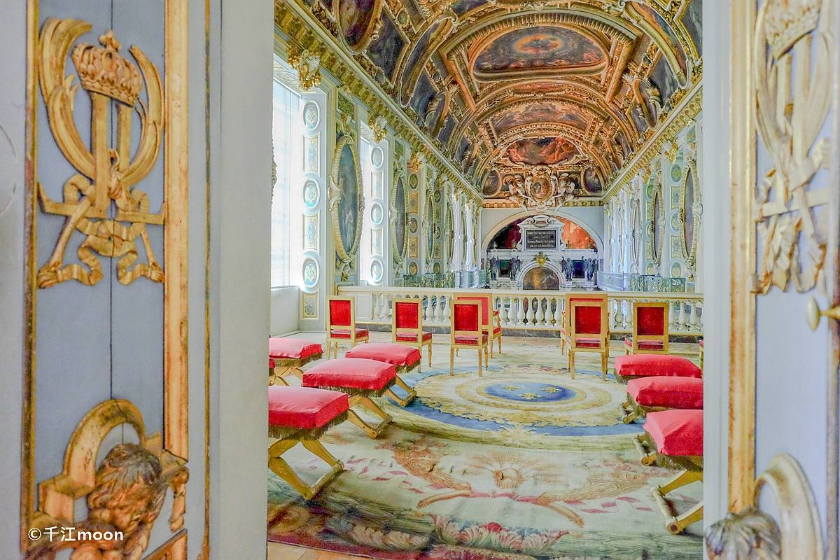 我最喜欢的戴安娜长廊长80米宽7米是城堡里面最长的走廊。1858年拿破仑三世将其改建为图书馆,存放有近16000部来自旧拿破仑一世图书馆的藏书。拿破仑的地球仪是1810年的作品,原在巴黎的杜乐丽王宫,1816年放置于此。入口处两对大理石廊柱支撑起高大的空间,气势恢宏。它让我想起布拉格的斯特拉霍夫图书馆。遗憾的是游客只能从这个方向看到图书馆的全貌,没办法进入仔细参观。