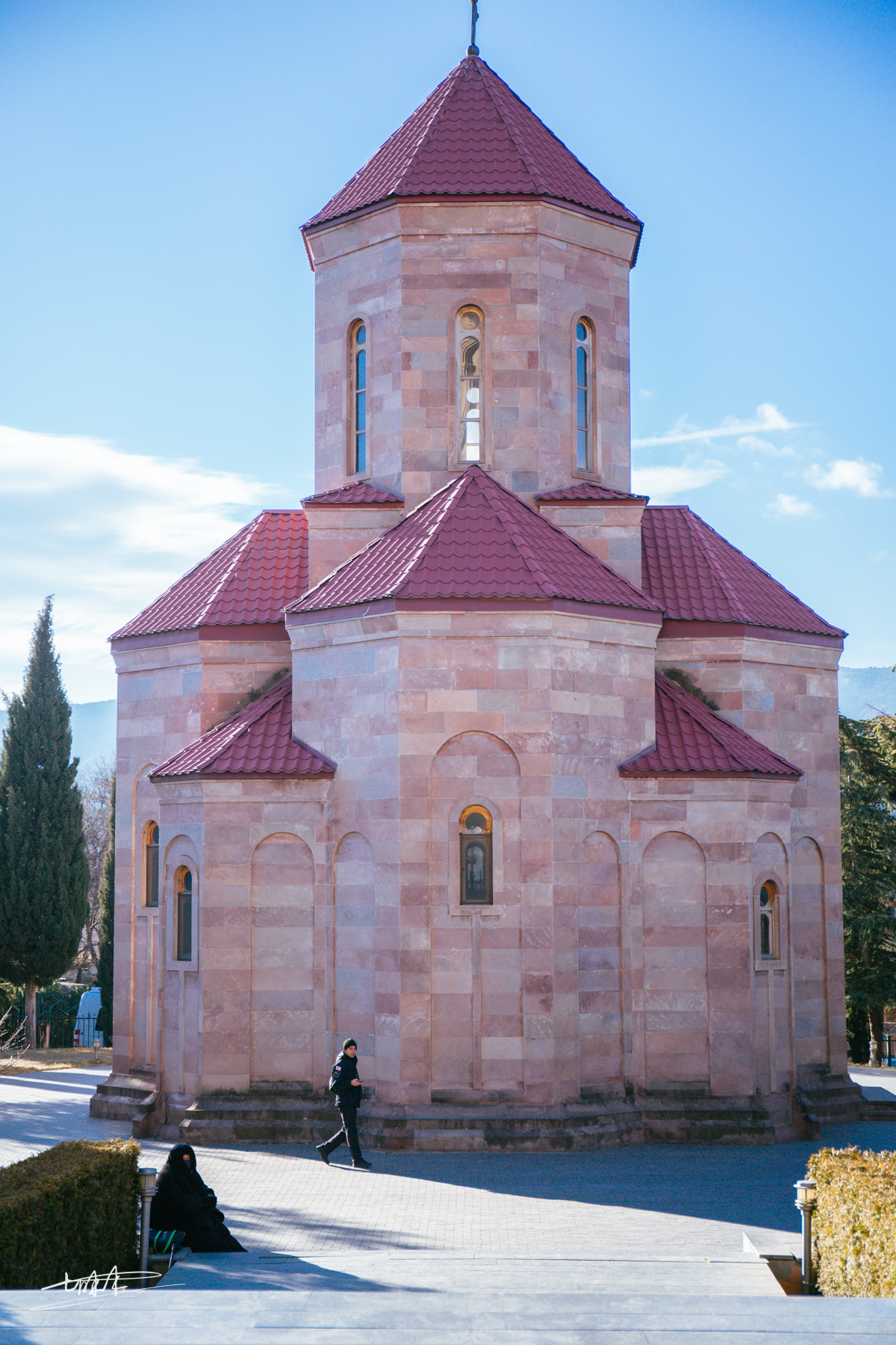 教堂与俄国的同属一宗,都是东正教。东正教是在罗马帝国分裂后产生的,主要的建筑特征有圆顶的屋顶,这个不起源于俄罗斯,而是拜占庭风格,比如圣索菲亚大教堂,不过在土耳其人攻占了拜占庭后把他改成了清真寺。第比利斯圣三一大教堂的洋葱顶做了改良,从外观看,无数层建筑叠起来,像是拼接的立体折叠画一样。