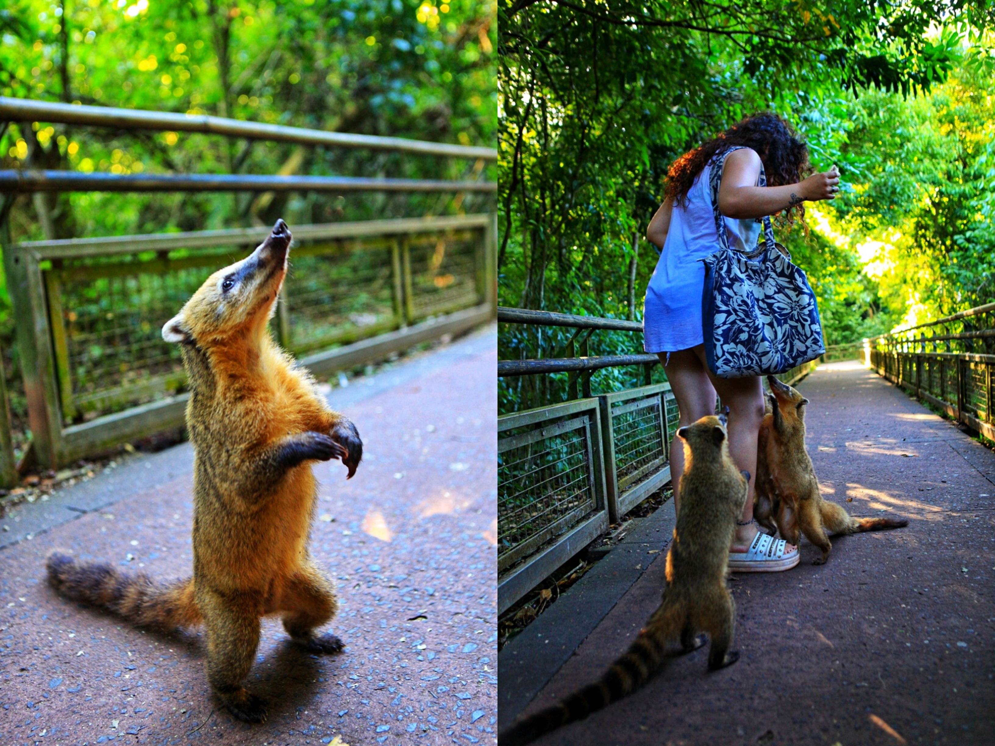 公园内有大量的Coati(浣熊),一位姑娘拿食物逗引它们,有几只浣熊便一直跟着她,频频站起作揖求食,最后竟蜂拥而上扑咬姑娘抢食,导致妹子大腿被抓得鲜血淋淋。