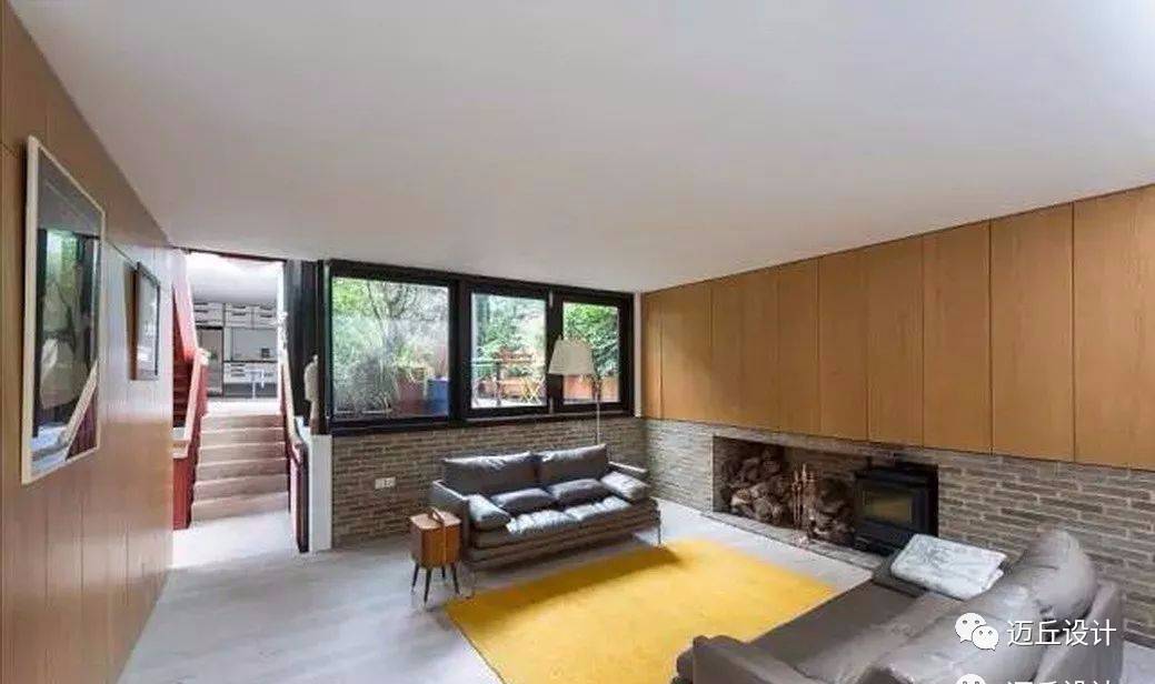 楼梯的一侧,有一个下沉式的客厅,视线透过窗户,正好看到庭院的景色,非常美好。大量的实木内饰,以及壁龛里装有壁炉,都让屋里倍感温暖。