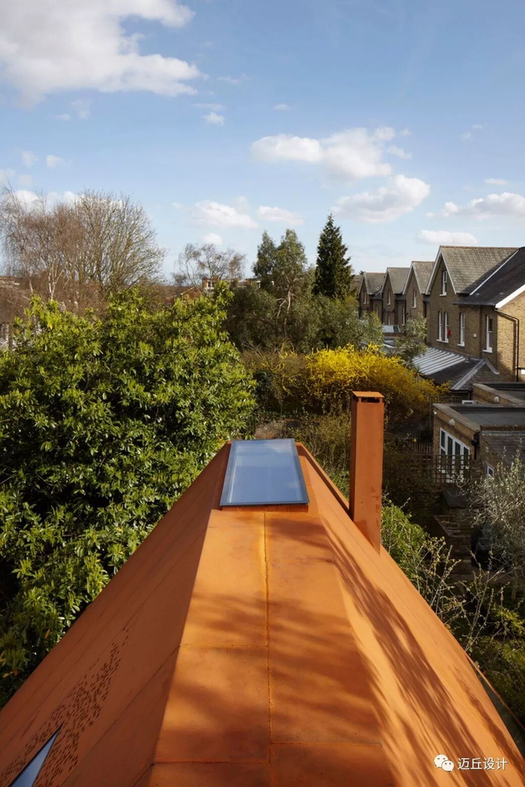 两个住宅的体量都由锈蚀钢构成,结构和表面形成了坚固的组合。这种锈蚀钢不需要维护,与围合的场地相呼应,并通过穿孔钢板达到了柔和的效果。深橘红色的色调和表面上的穿孔呼应了附近裘园中的光线和秋天的颜色。