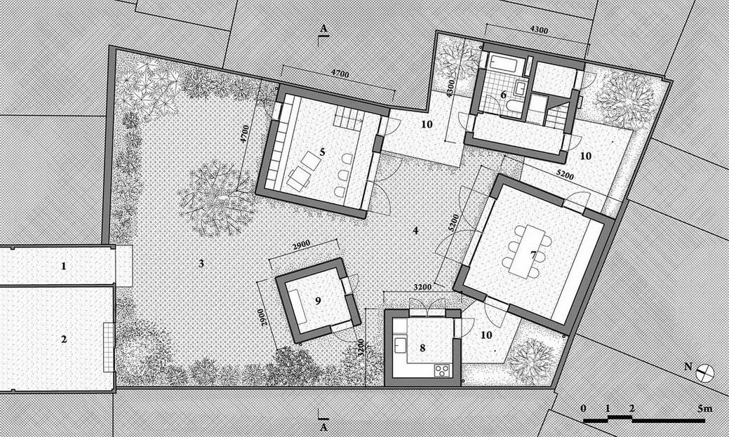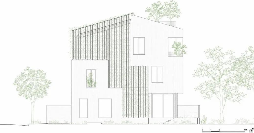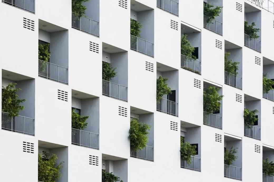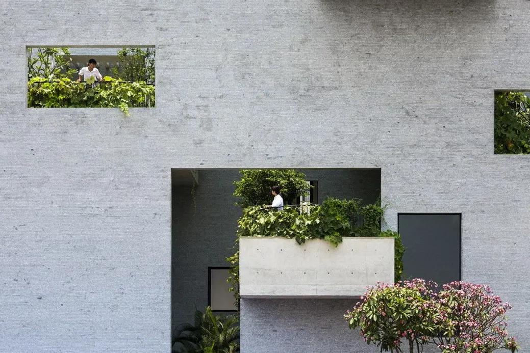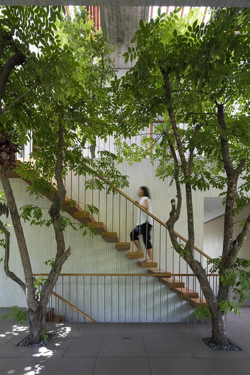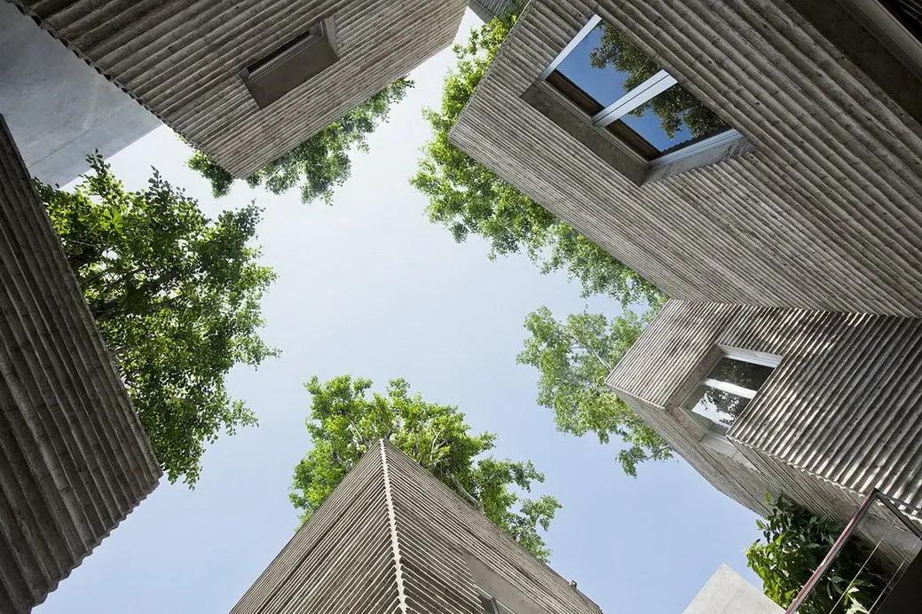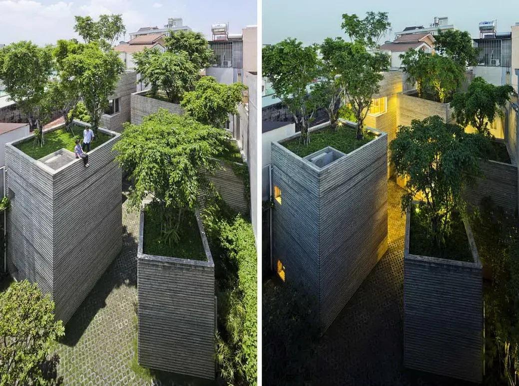 为了应对越南城市快速甚至完全的城市化趋势,武重义事务所设计了这所位于胡志明市绿色住宅。 建筑旨在重建居民与自然之间的联系,被称为“树之家”。 建筑包含五个独立的意象为花盆的混凝土盒子,这五栋独立的房子在这个不规则的场地中央围合成了一个院落,创造出几个小的相互联系的花园。