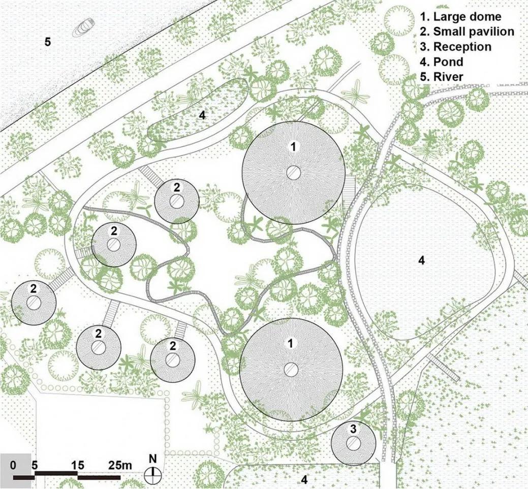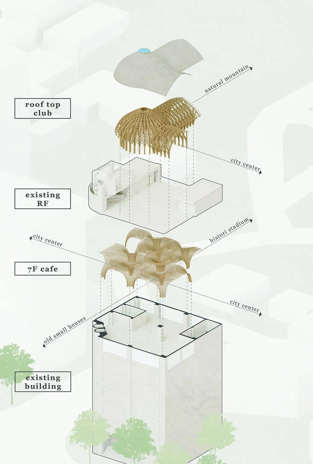 巨大的圆顶结构为咖啡厅赋予了引人注目的外观,在荣市的上空形成一个开放共享的聚会空间。 圆顶和矩形体量迎合了建筑既有的L形布局。 它还连接了两个竹制的拱形结构,使空间得以充分敞开于城市景观。
