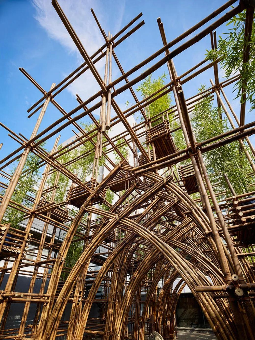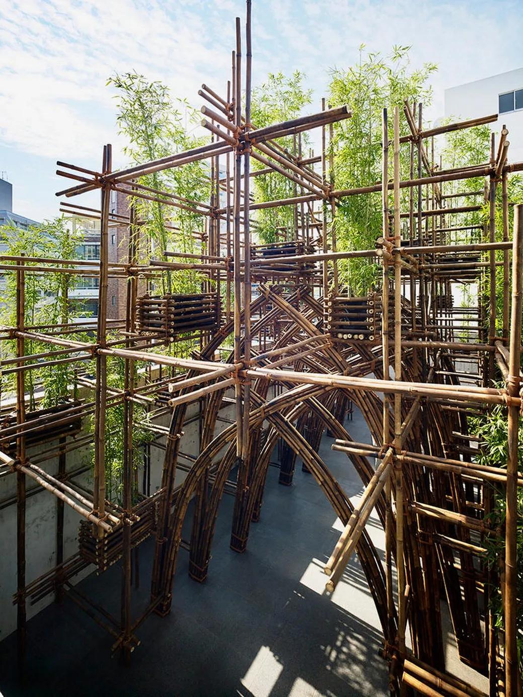 越南建筑事务所完成了其在日本的第一个作品,是一座为东京六本木的“TOTO GALLERY MA”建造的竹林馆。 该竹林馆由纯竹 结构构成,其中包含了三种结构元素: 网架、拱架和竹箱。 两个彼此交接的网架形成了整个体量,同时插入11个拱架创建出一系列的公共空间。