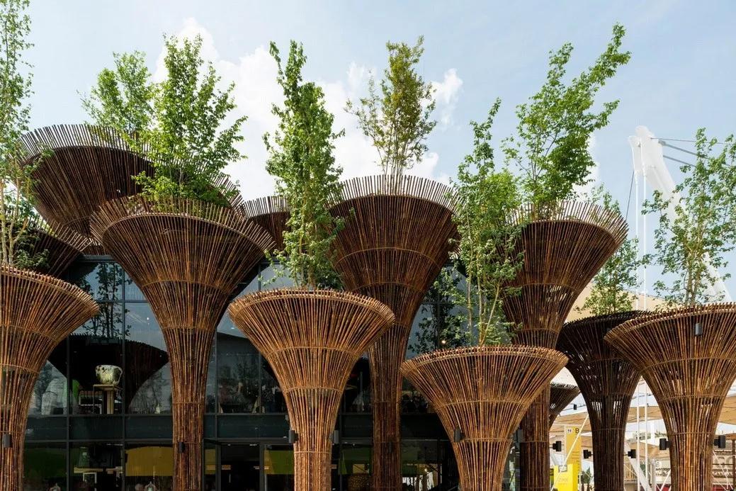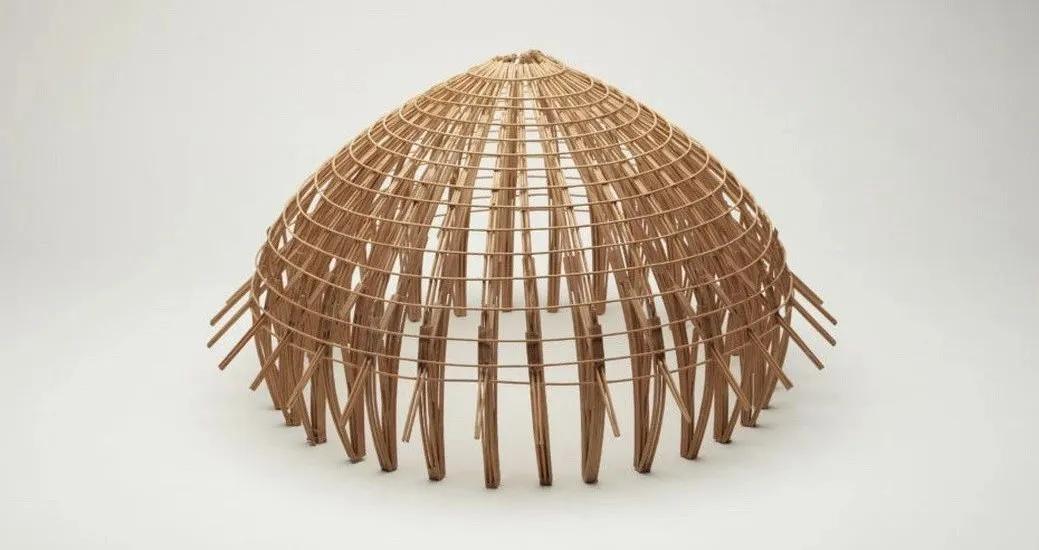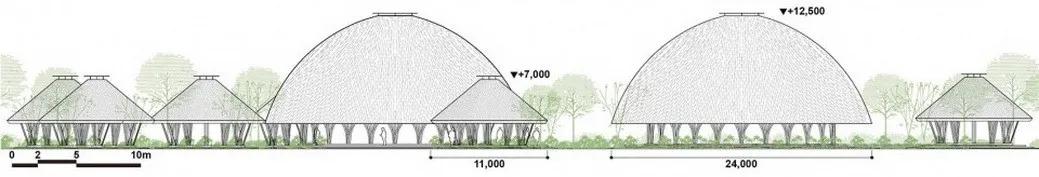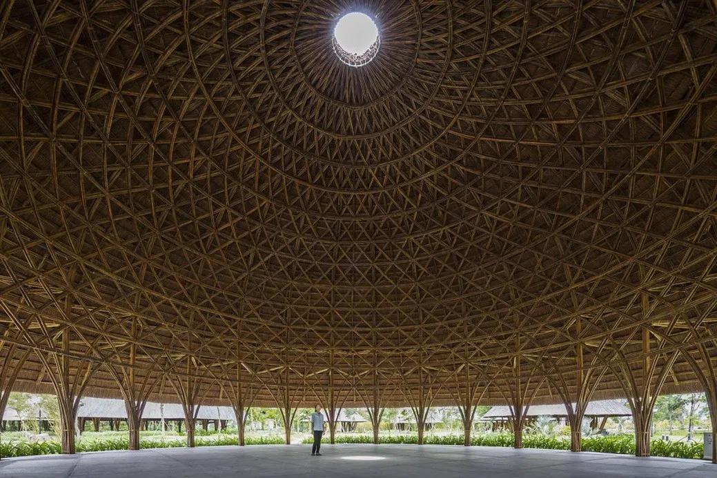 整个设计的灵感来源于用于庇护飞鸟的传统竹篮子。 展馆采用双分层穹顶结构, 覆盖着茅草的外层屋面从内部篮子状的结构中延伸出去,形成深厚的挑檐,挑檐的设计保护了内部竹结构免受日晒风吹。