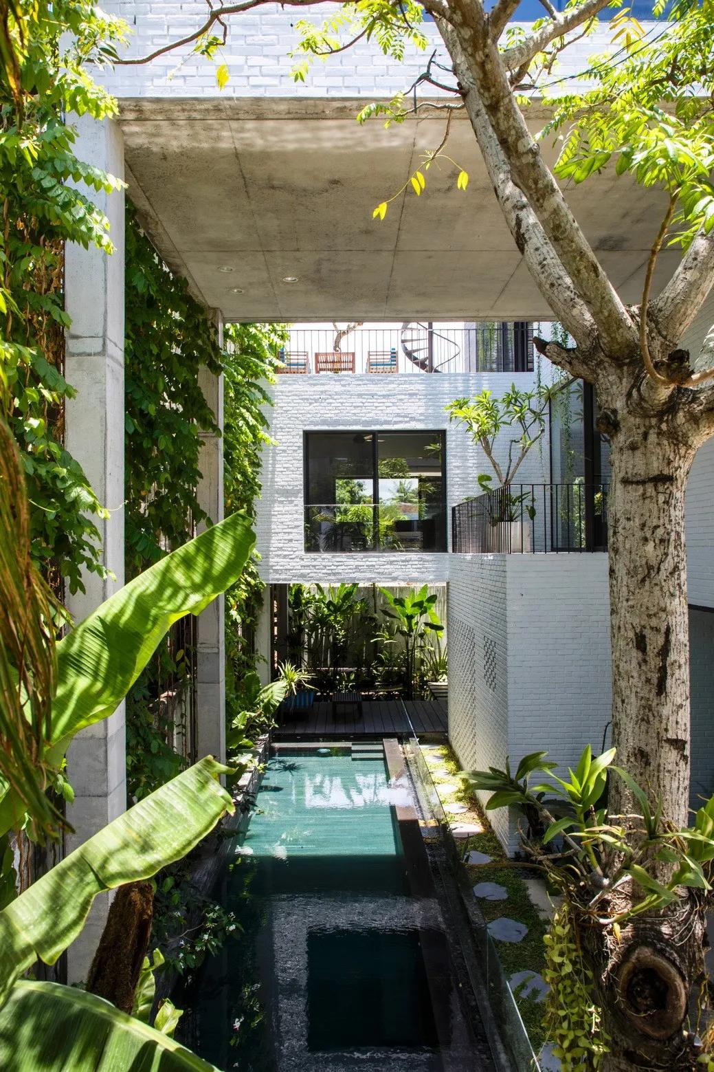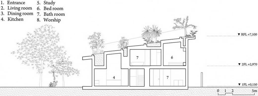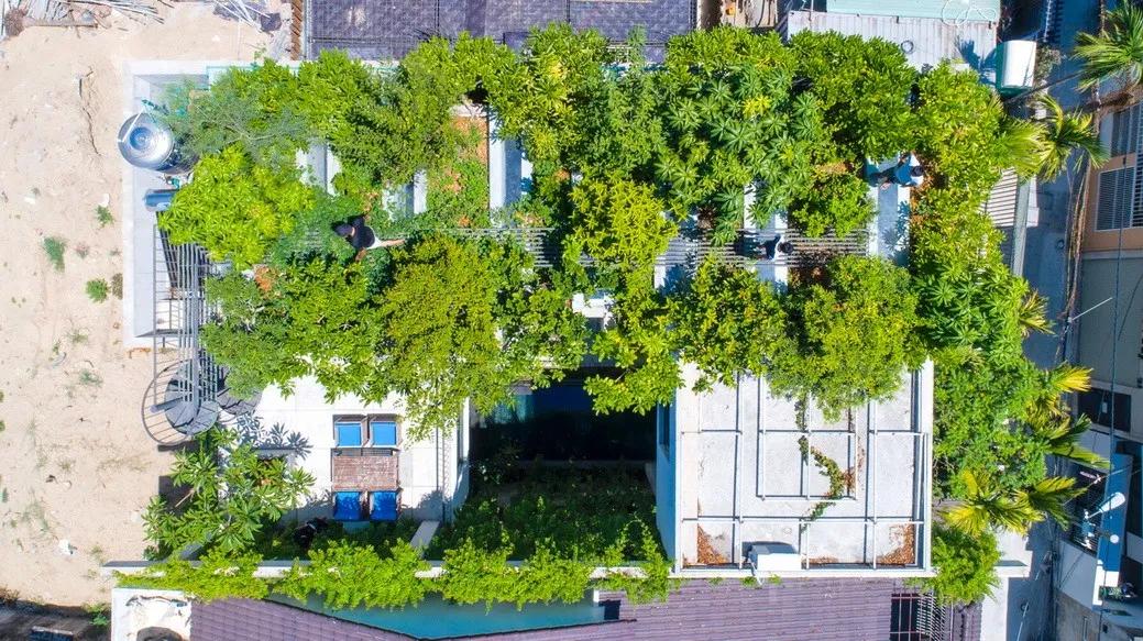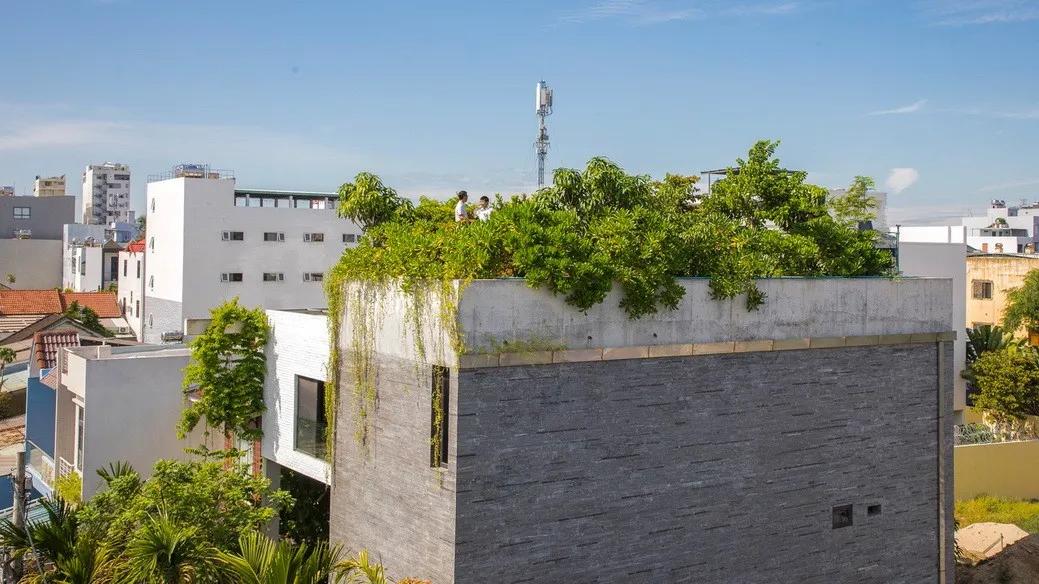 Thang House 由砖砌和石箱围绕着一个绿色庭院堆砌而成,是武重义建筑事务所“树木之屋”系列之一。因 建筑工程而损失的绿地面积由屋顶上的果园补偿,该果园可以吸收阳光并遮盖建筑物。该绿色住宅 通过提供可持续发展和环保的建筑,为城市景观的绿化和栖息地的改善做出贡献。