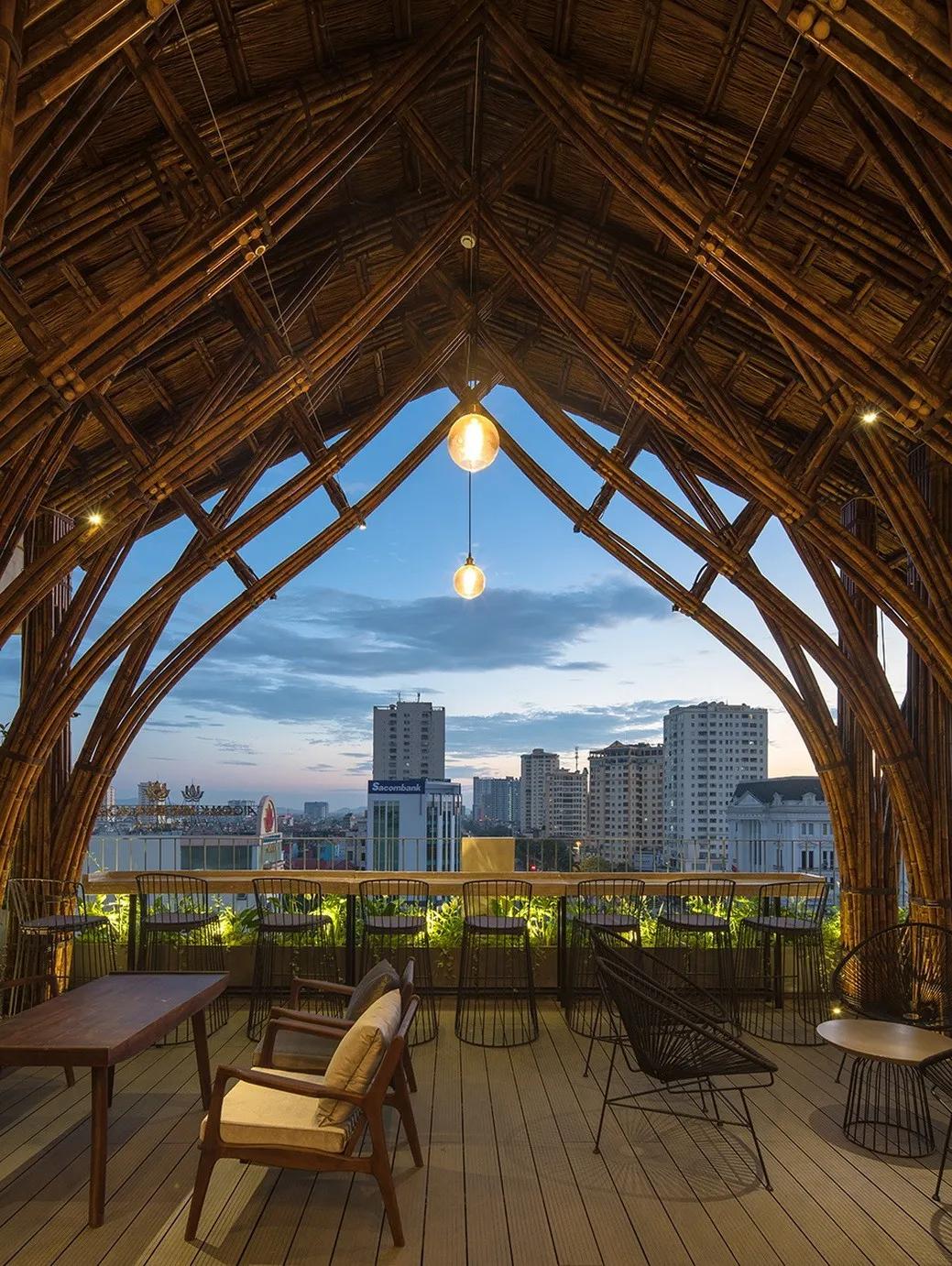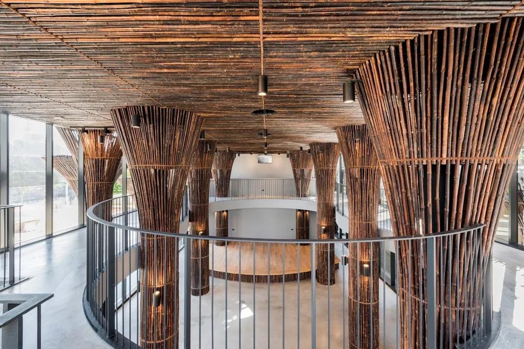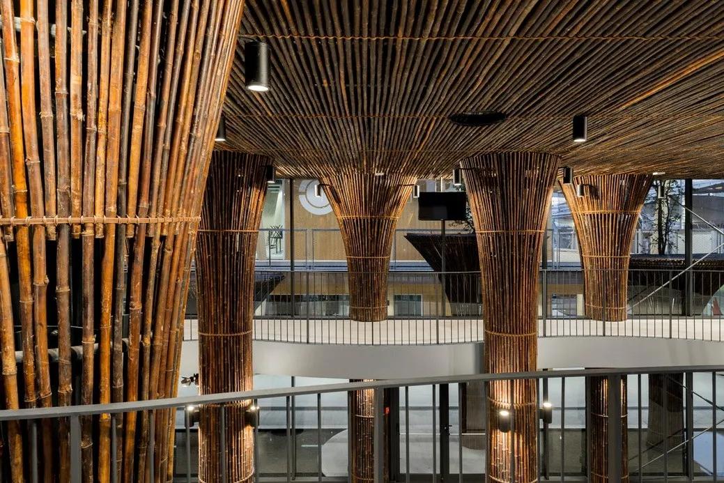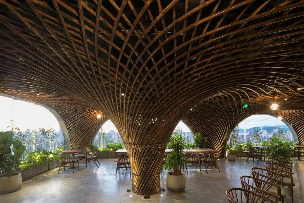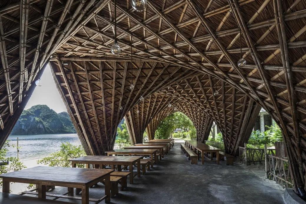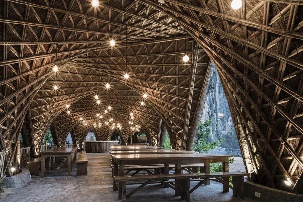 比如武重义在越南昆嵩设计的印度支那咖啡厅(Kontum Indochine Café),由5×3组巨大的竹簇作为支撑结构,而这些呈倒锥形的竹簇的设计灵感就是来源于越南渔夫在捕鱼时所用的一种由竹子编织而成的竹筐。