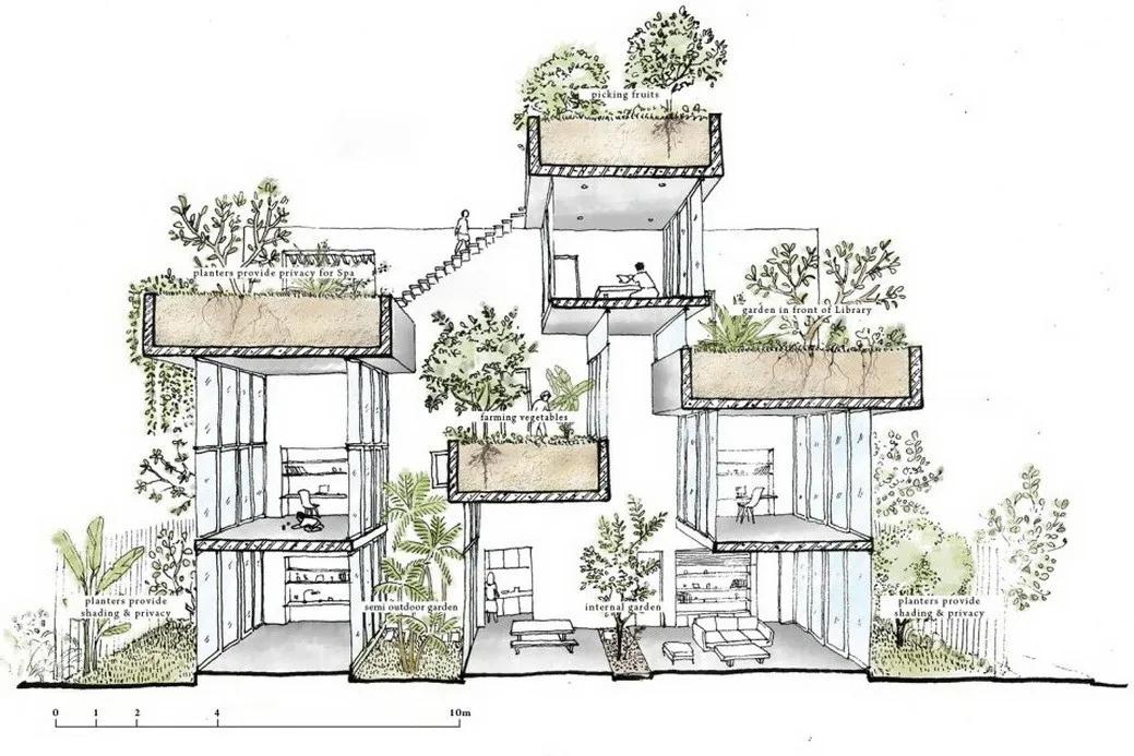 建筑的每一层都设有户外花园并通过滑动玻璃门分隔室内外空间。 这种设计方案充分利用自然通风设备改善微气候,同时有利于调节各个房间的采光。