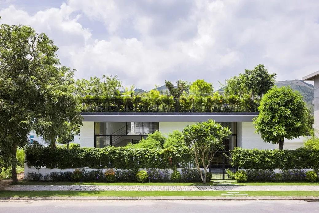 住宅位于越南中部城市芽庄,延绵的群山环抱着城市,遥望大海。 巨大的屋顶上植被繁茂生长着,悬浮于空中的花园满足了业主在这片小小的场地上建起一座拥有大花园的宽阔住宅的愿望。这个巨大单坡屋顶的存在意义已超越了私人住宅,而是成为了整个邻里社区之内共享的小花园。