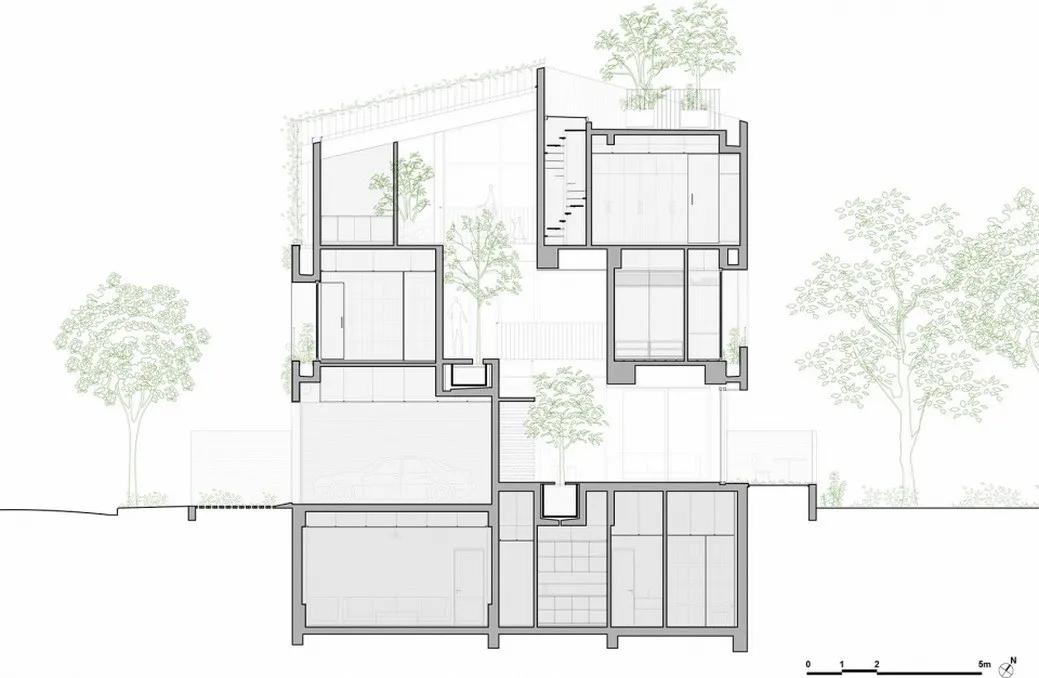 场地位于胡志明市的一个新住宅区域内, 建筑师将重点放在设计一座将公园绿色景观引入室内空间的住宅,让它成为环境的延伸。这座住宅是武重义事务所“House for Trees”(树林之屋)系列之一,设计团队寻求即使在小型住宅中都尽可能的融合绿色植被,在城市中创造一片公园,最终使“绿色建筑”遍布整个世界。