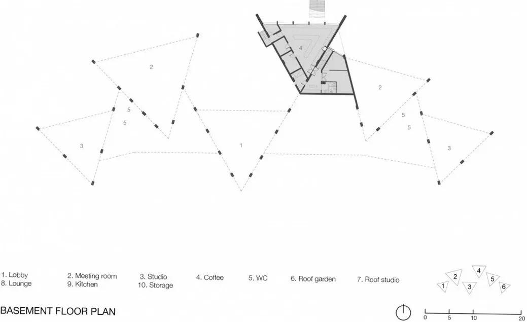 Viettel Offsite工作室位于河内约30公里处的郊区,工作室场地处于一片平缓的斜坡上,毗邻静谧的湖泊,四周绿荫环绕。 六个V字型墙面体块沿着场地自由布置,通过一处开放的走廊连接。 这些体块形成三角形空间: 两侧封闭,一侧朝向湖面和树林开敞。