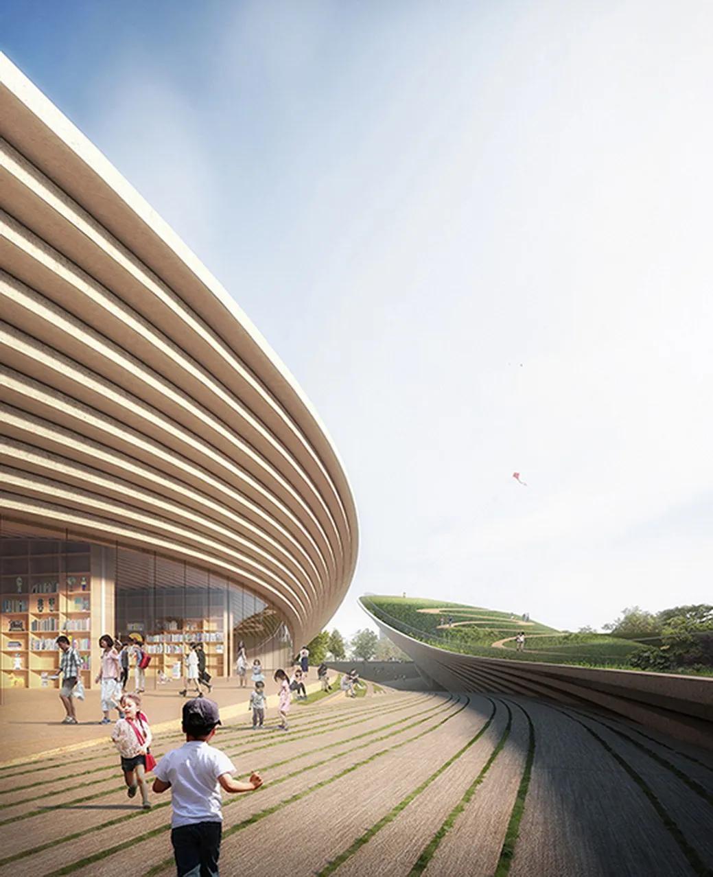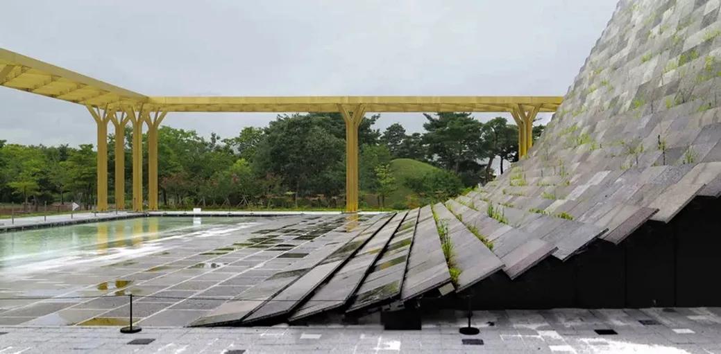 隈研吾建筑都市设计事务所为韩国庆州世博会设计了纪念馆。砖块形态的材料堆叠成纪念亭,从地面向上倾斜延伸,既具有建筑特色又具有地表形态。设计团队提出了在地面和建筑之间建立“连接”的概念,向世人传达“持久存在、交流融合”的信息。