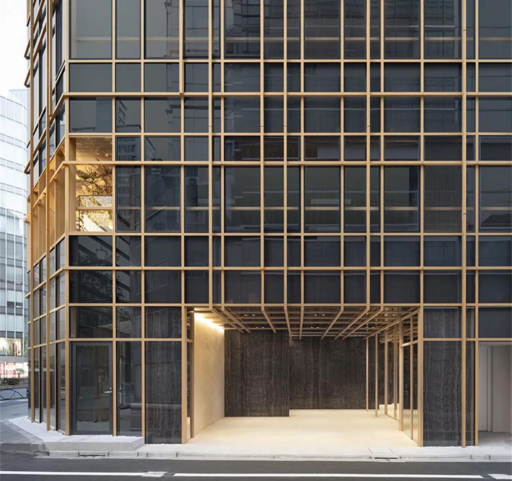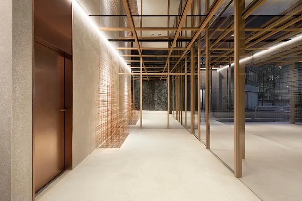 与外部使用的木材不同,办公室的内部设计包括原石和青铜色的不锈钢。地板和墙壁是手工抹灰的,以创造一个不均匀的,纹理的外观,唤起一种自然的品质。尽管如此,室内的灯光设计像室外网格一样编织,直接指向地板和天花板,给人一种纵深感。