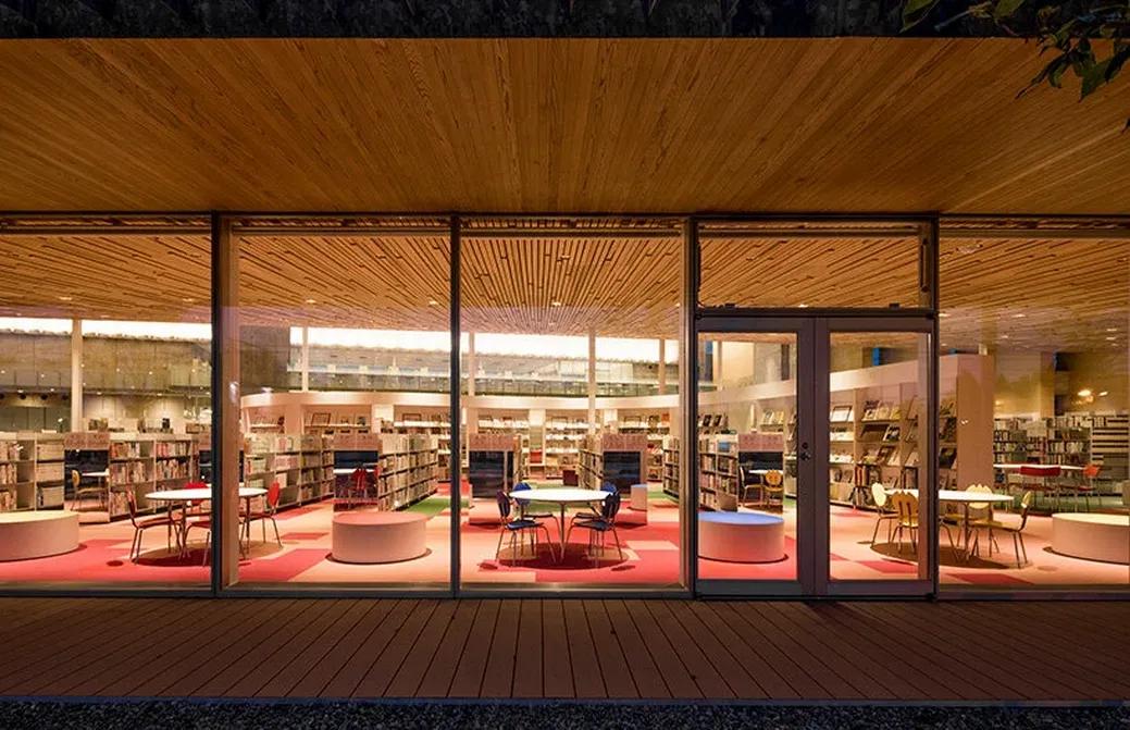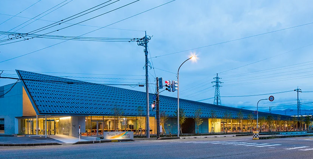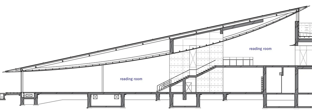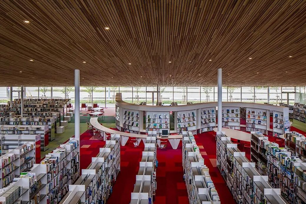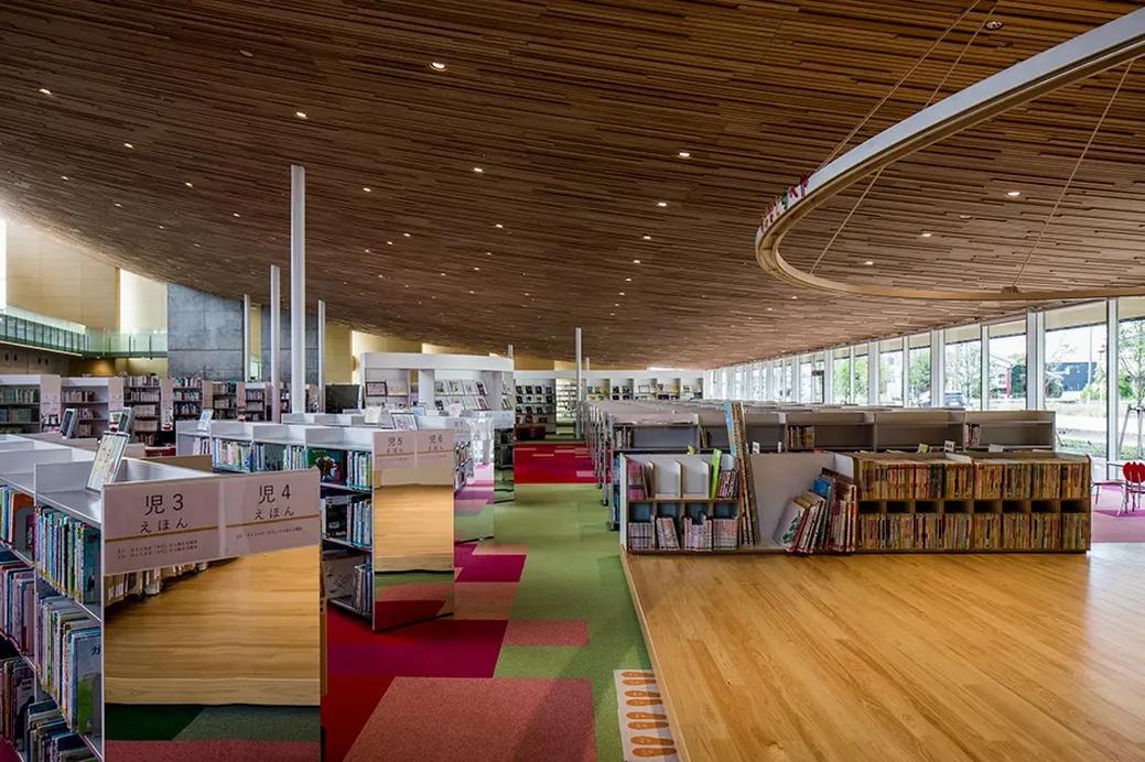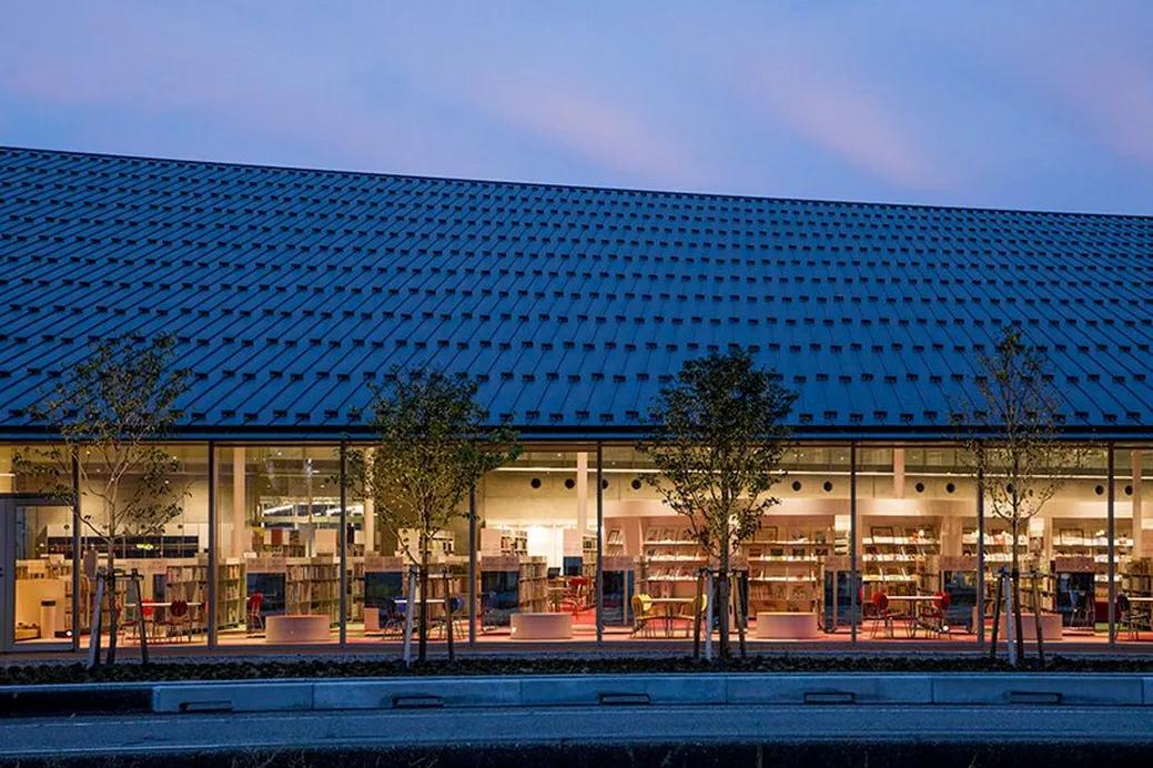 图书馆大面的落地玻璃向街道行人透露着内部的空间。图书馆体量庞大的屋顶,成为tonami市的新地标;空间的内部也由独特的顶篷定义,倾斜屋顶将光线引入整个空间。进入图书馆的访客被温暖的木头装饰和透过高高天窗与落地窗引入的自然光线所笼罩。