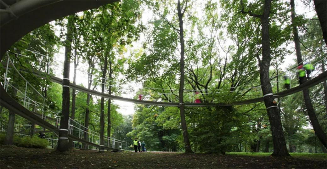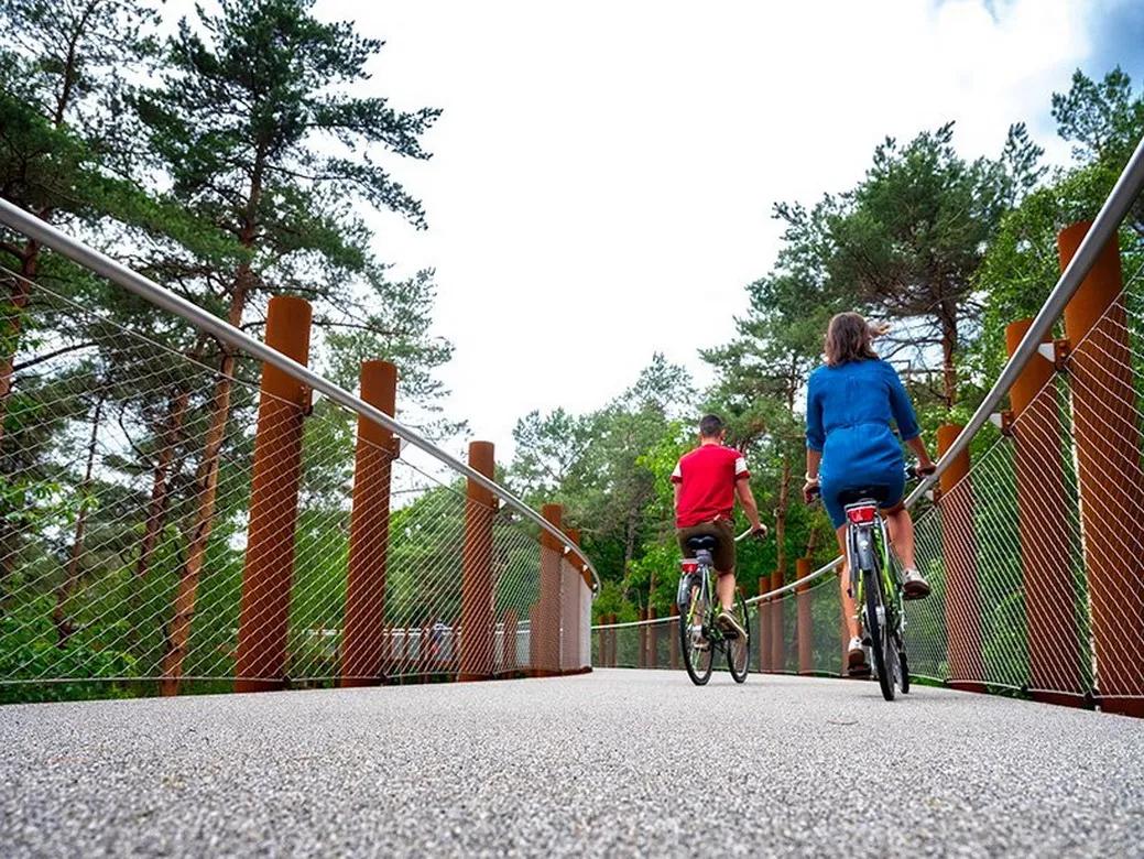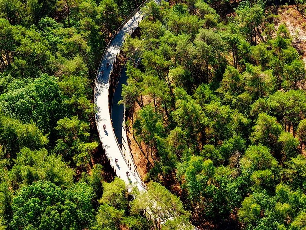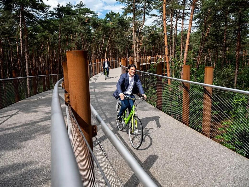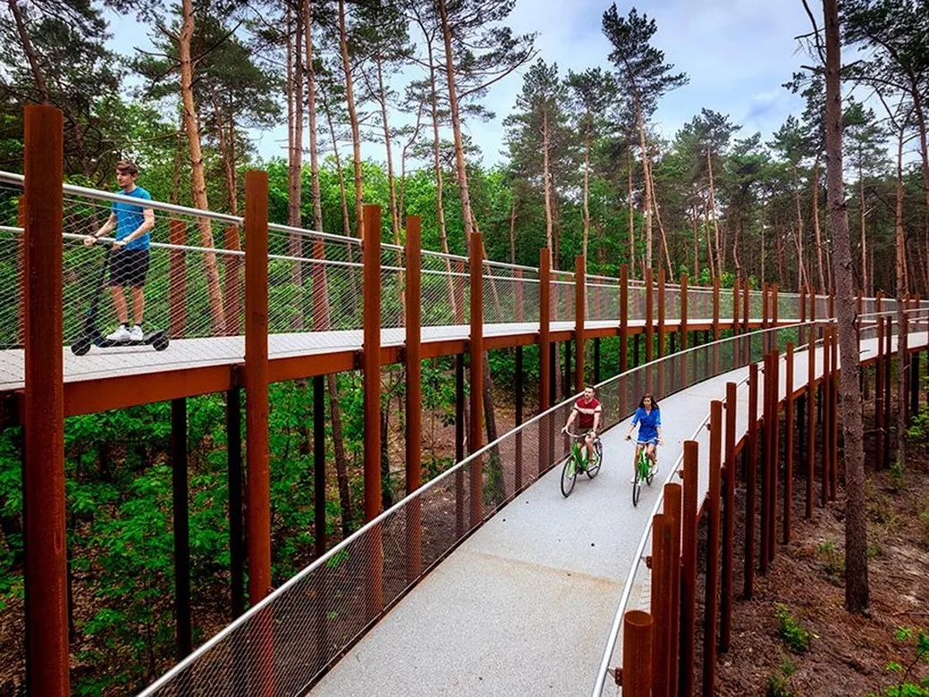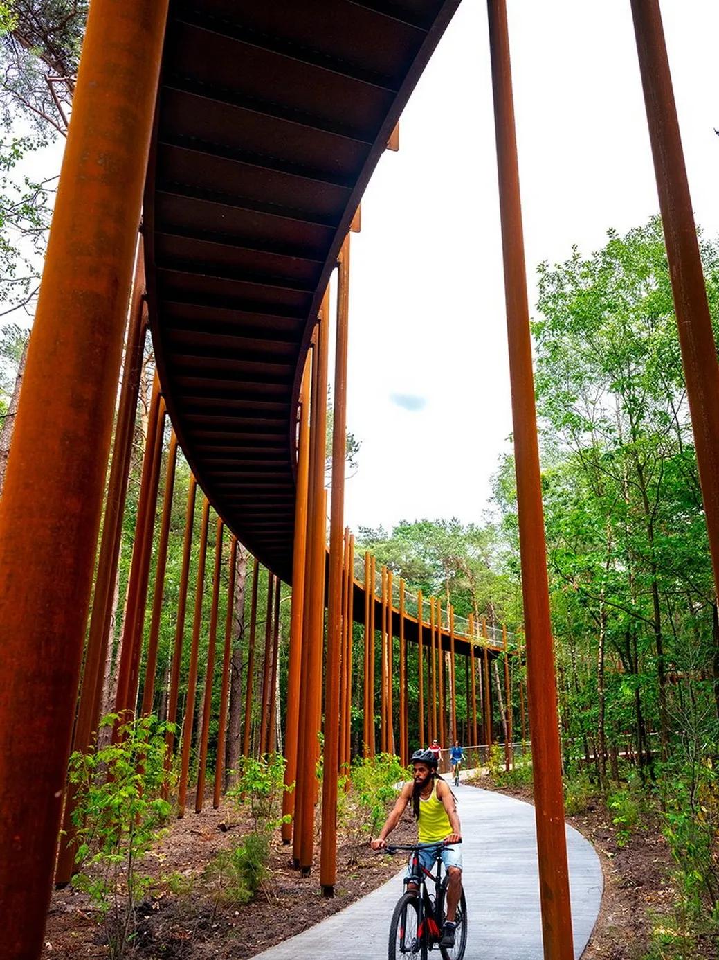 比利时工作室BuroLandschap和De Gregorio&Partners在林堡省创建了一个名为“骑自行车穿越树”的循环赛道。项目是一条高架自行车道,它让骑行者得以在距离地面10米高的森林中享受运动的乐趣,仿佛骑行在丛林树梢间。