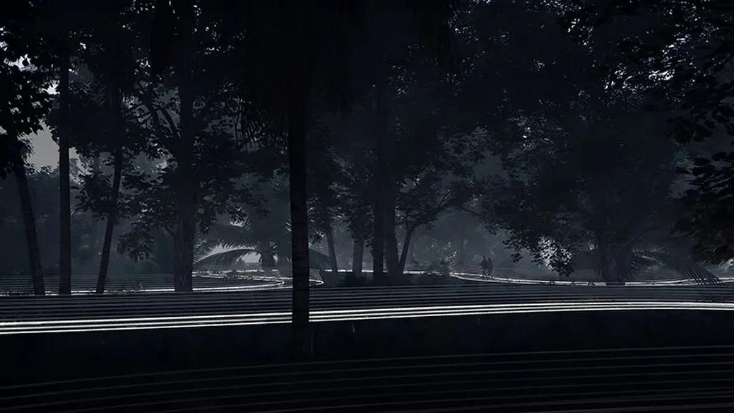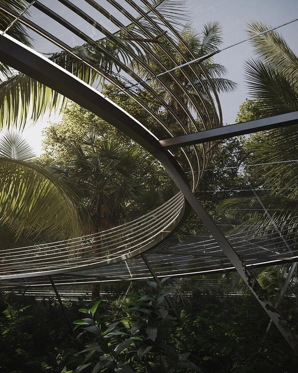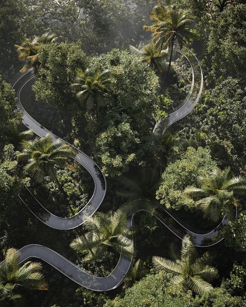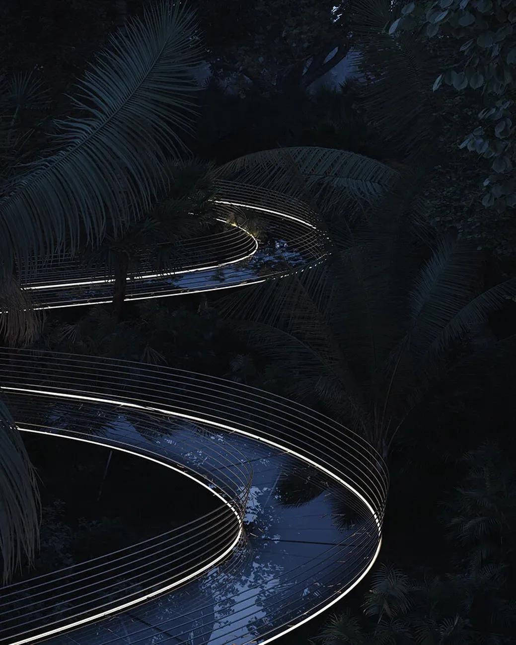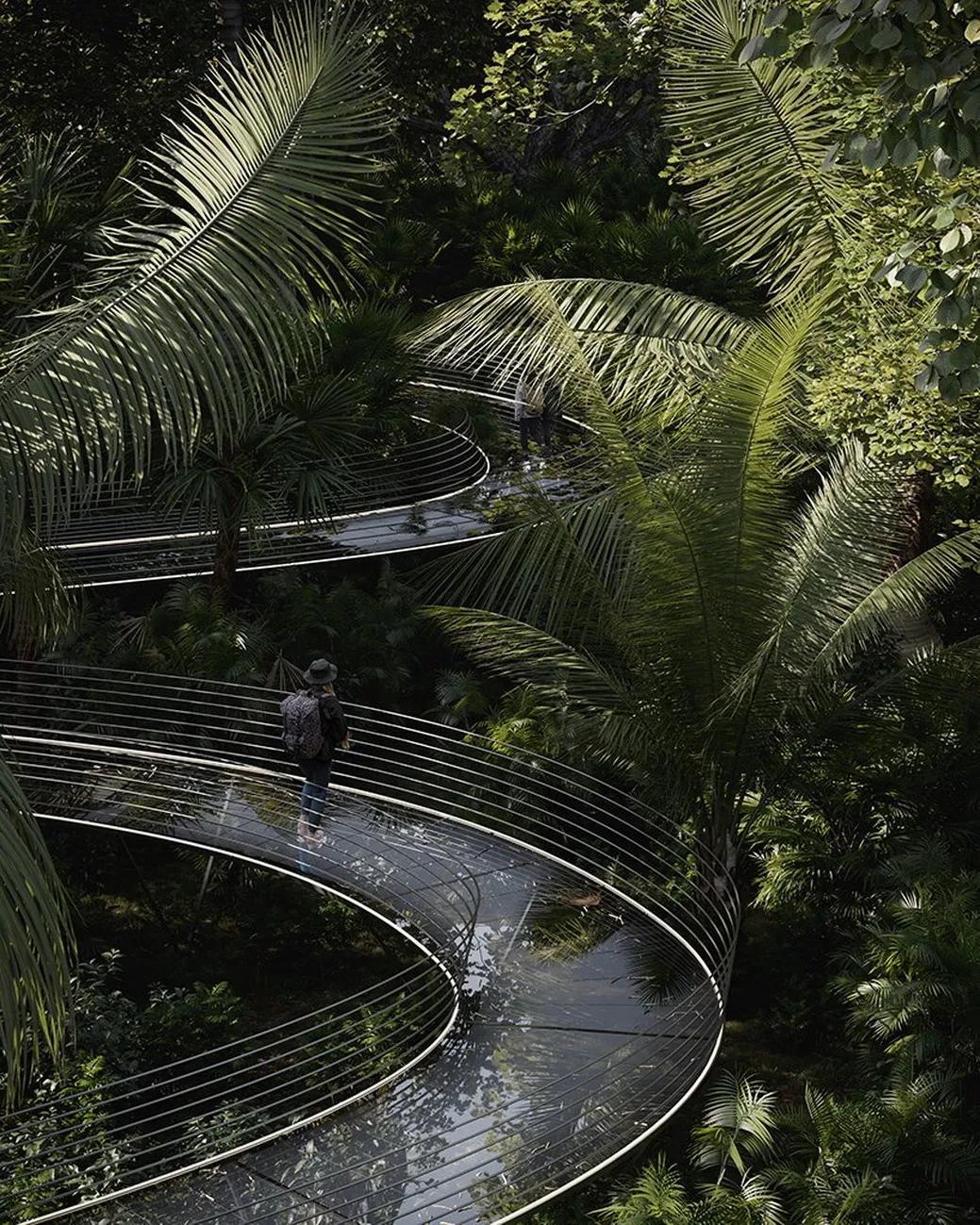 建筑可视化艺术家Iryna nalyvaiko设想在丛林景观中搭建一个高架的玻璃人行天桥,蜿蜒穿过茂密的林叶,最大程度减少对地面影响的同时,为游客提供极佳的观景视野与沉浸体验。