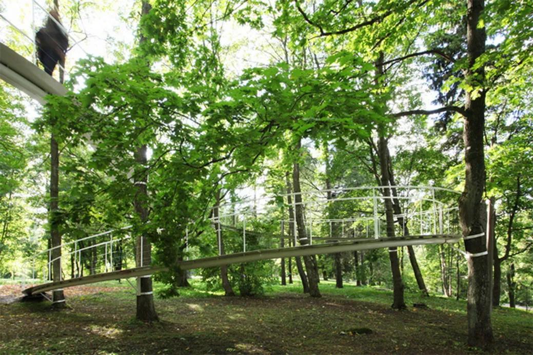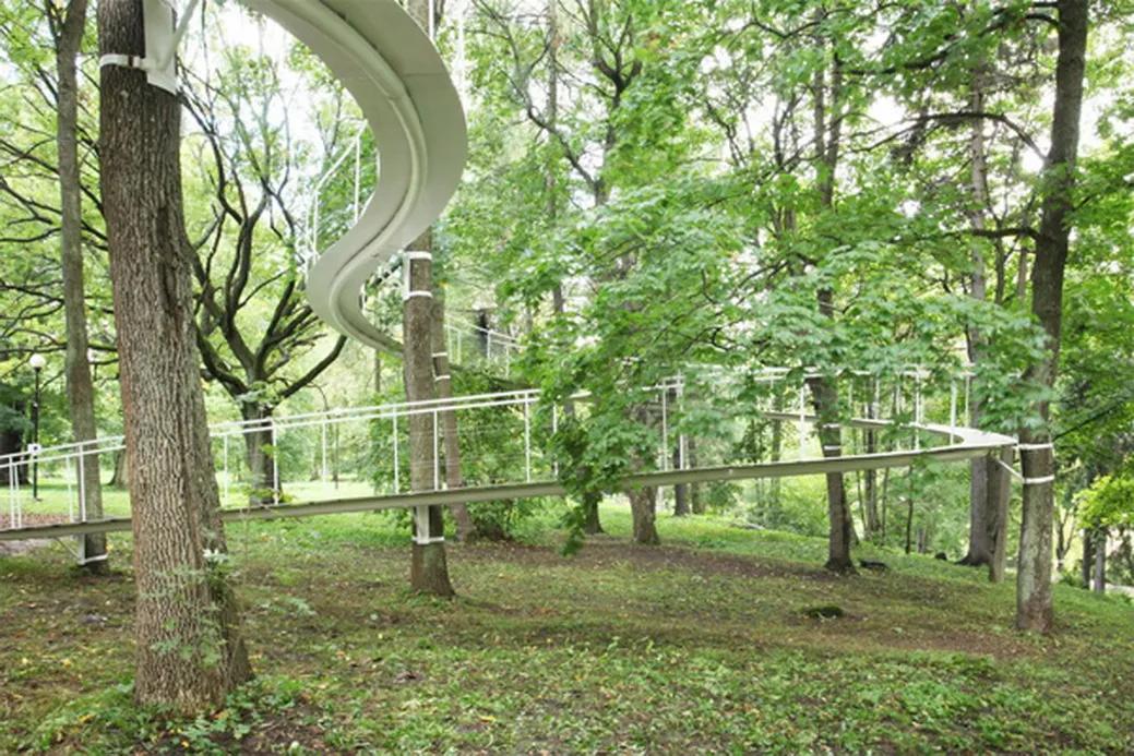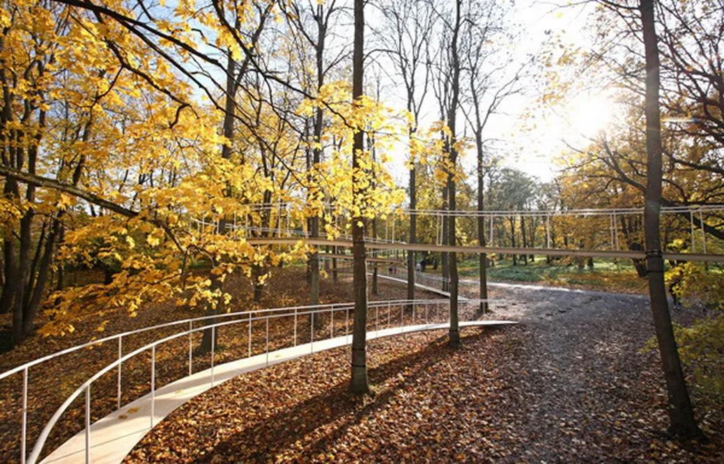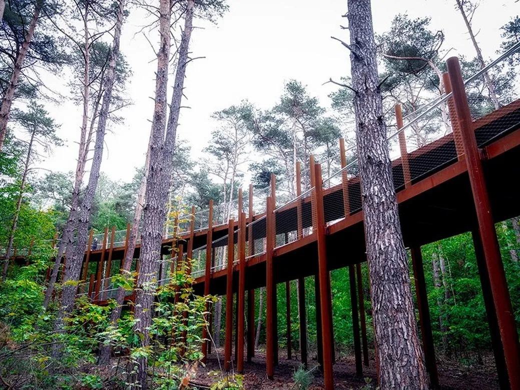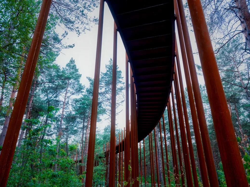 这一森林小径长95米,由由一根支撑在树干上的钢管支撑,没有额外的柱子,像是一条悬空的天路,与清新的森林融为一体。