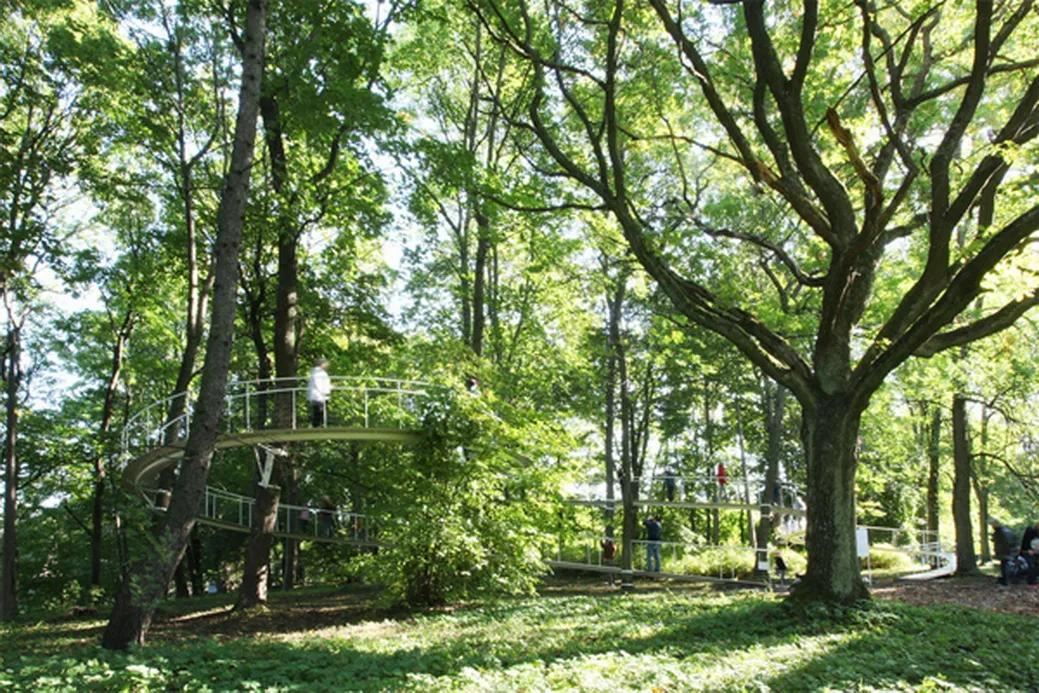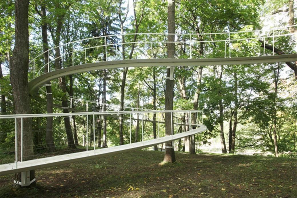 这条三米宽的小路长约700米,以缓缓的坡度上升到10米的高度,然后再下降到森林地面,形成了直径近100米的螺旋双圆结构。