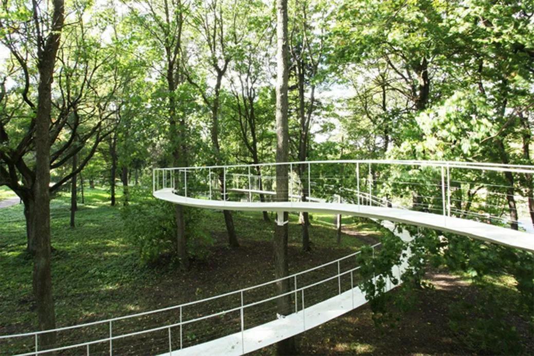 Tetsu o Kondo Architects的人行道在树干上蜿蜒,从地面盘旋上升至树冠层,沿着小径漫步,可以欣赏到不同高度的生态景观,