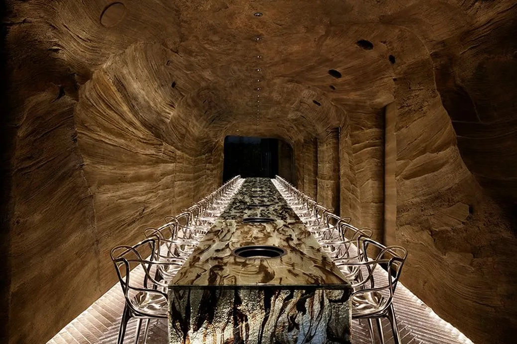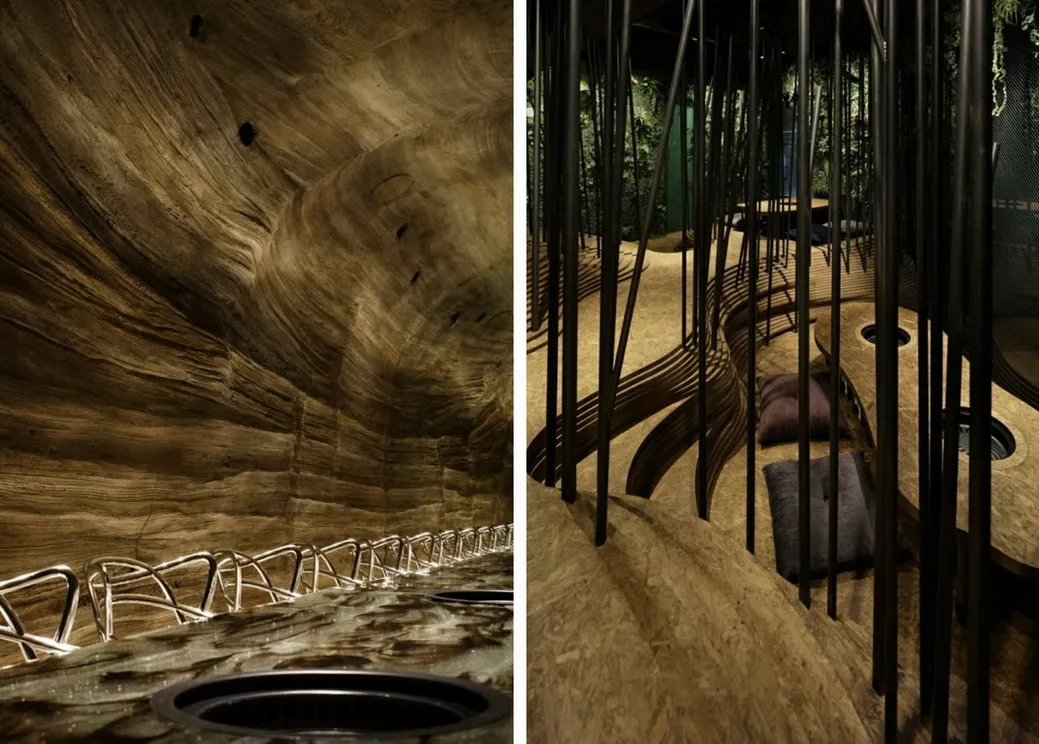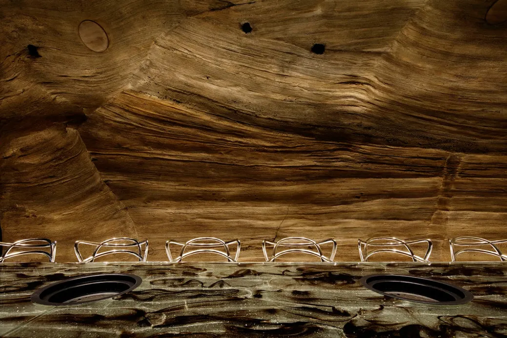 这些墙的构造看起来像真正的洞穴墙。人字形的玻璃地板代表着水流,在桌下,你会发现并感觉到由玻璃制成的沙砾,仿佛你真的坐在河边。此外,独特的桌子使它看起来像烟雾被困在里面。