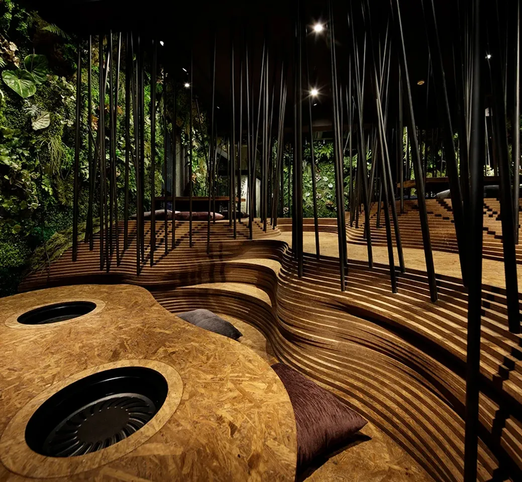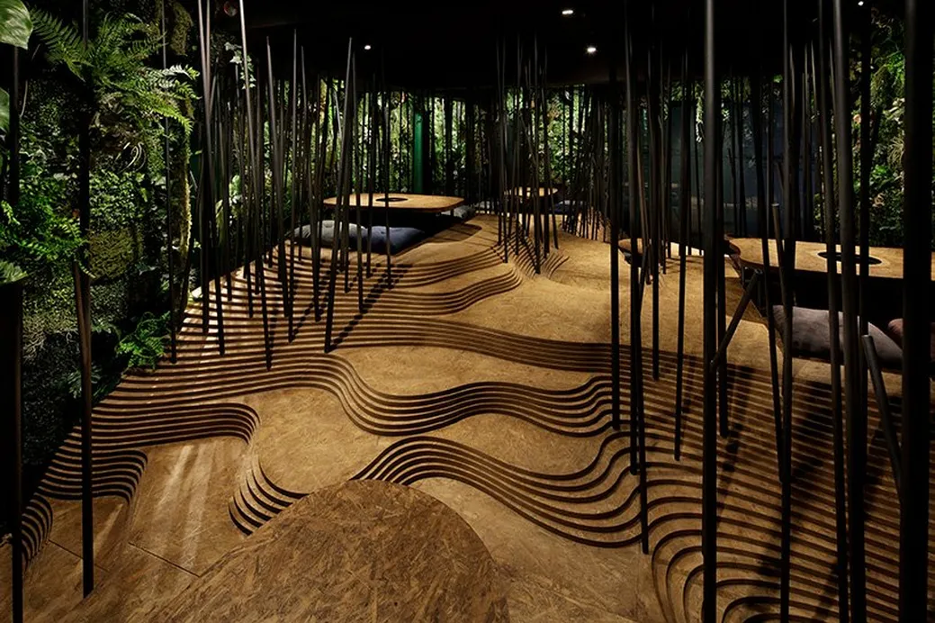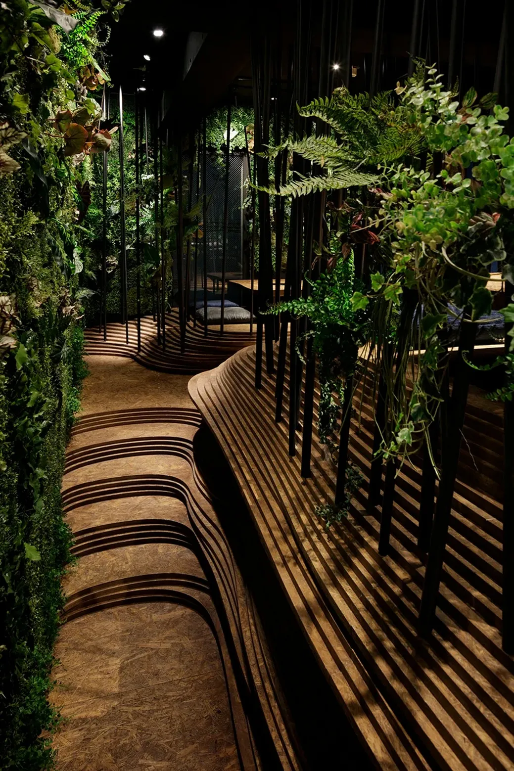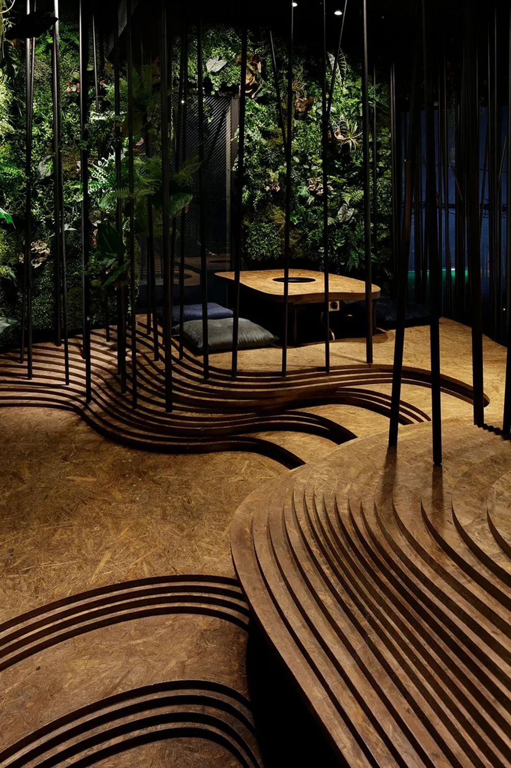 在二楼用餐就像坐在森林的中央。你被钢管做成的树和墙上的绿色植物包围着。桌子和地板由多层OSB面板组成,具有自然的轮廓线。