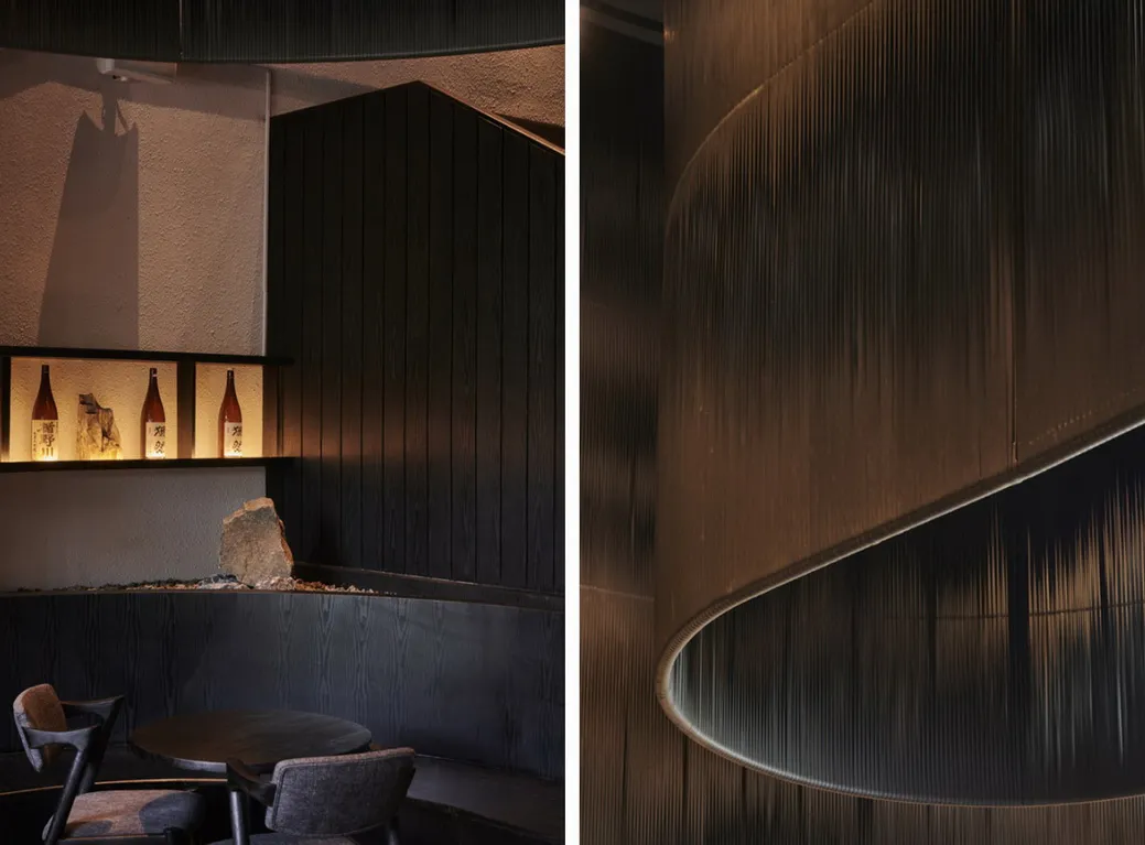 深色为主色调的调色板与温暖的照明相结合,营造出神秘而温暖的内部氛围。结合了本地使用的天然材料(例如深色木材,天然石材和砾石)模拟在大自然中的户外体验。