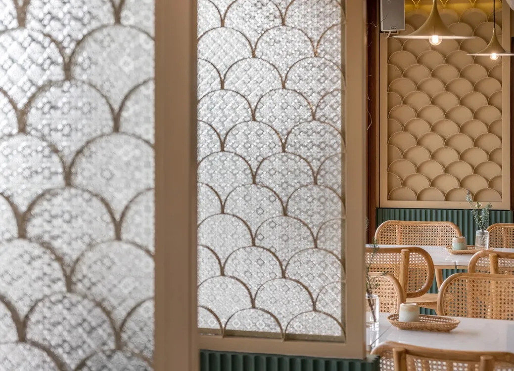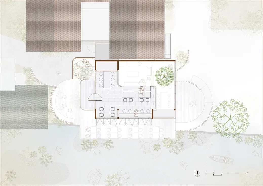 设计根据棕榈叶编织缠绕的线条感,使用了灰色砖砌材料打造了一条进入餐厅区域的步行线,这条砖线盘绕并将外部空间连接到建筑物中。
