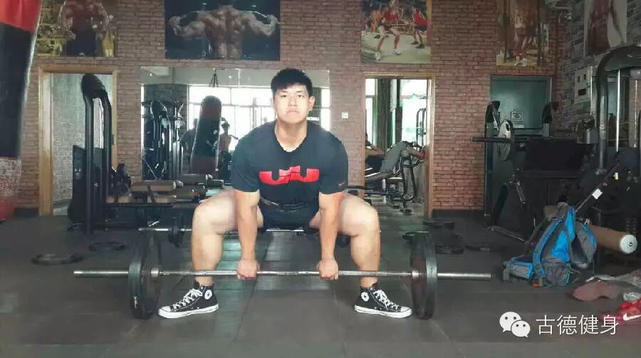 第二部分拉起杠铃:提拉杠铃时憋气,双脚向两侧蹬地,双膝有一种向外推得感觉,使用爆发力启动伸髋移动杠铃。当杠铃动起来以后,立刻全力伸膝,当杠铃过膝时,应及时伸髋至完全直立,全程杠铃紧贴腿部,匀速上拉,挺胸,眼向前看,核心部位保持紧张,不弯腰,背部不能出现明显弯曲,肩部向杠铃后移动,直至身体完全直立,膝关节保持稳定,呼吸随着杠铃的移动慢慢呼气。如果你的站距非常宽,注意放下杠铃时不要砸脚。