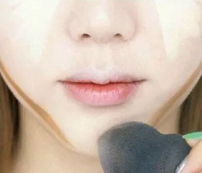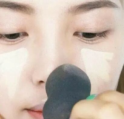 现在要来推匀刚画好标示的部位。用海绵将刚画好亮色修容的位置用轻拍方式轻轻拍匀。