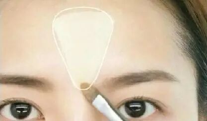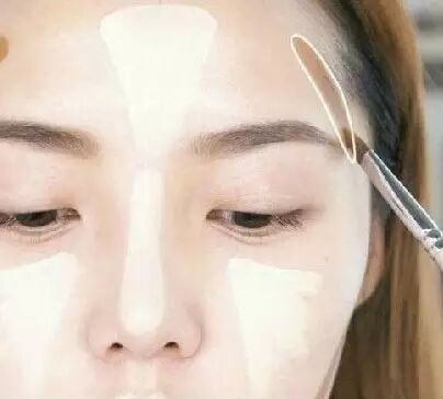 用亮色修容在额头中央描绘出长型的倒三角形。从眉头中心开始,越向上越宽,额头看起来越长,脸型相对也会变长。