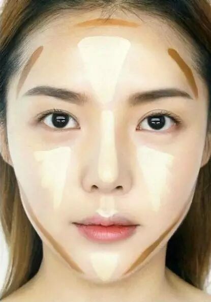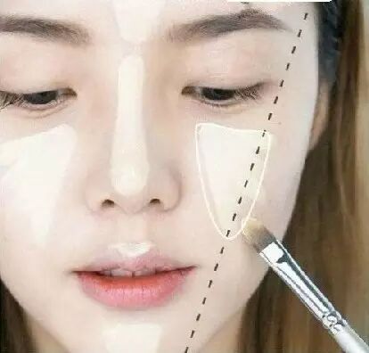 圆脸虽然很可爱,但给人宽大的感觉。如果想修饰这个缺点,就要利用倒三角形修客并直向打亮,脸看起来才会修长。这个倒三角形轮廓修饰法不仅能让睑变修长,还有纤瘦的视觉效果。